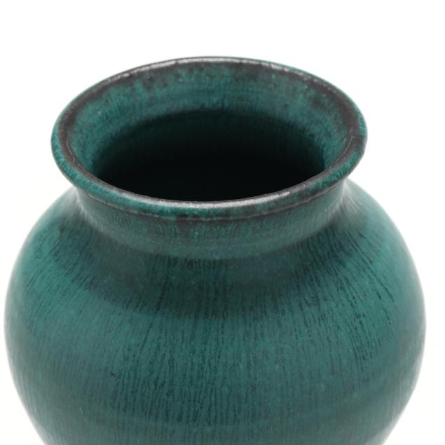 Detroit, Michigan, flared neck with bulbous shoulder, streaky matte malachite green glaze, worn impressed manufacturer's medallion mark 'PEWABIC DETROIT' to underside.