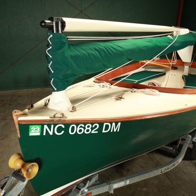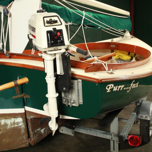 Open cockpit design, with a hinged mast, transport support, and sail cover for easy transport and use. It has a solid fiberglass hull and side decks, with a centerboard for shallow water sailing. The boat also features teak trim, molded seats, and burnished bronze hardware. A 3.5hp four-stroke Johnson outboard engine manufactured in 2004 is mounted to the rear. With seat cushions, and covers for sail, cockpit, and entire boat. The teak is finished with varnish, and the hull painted green with bone deck and interior.