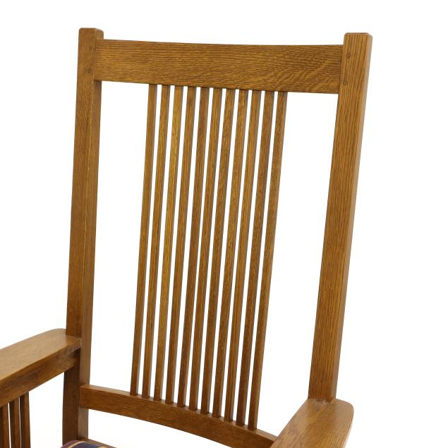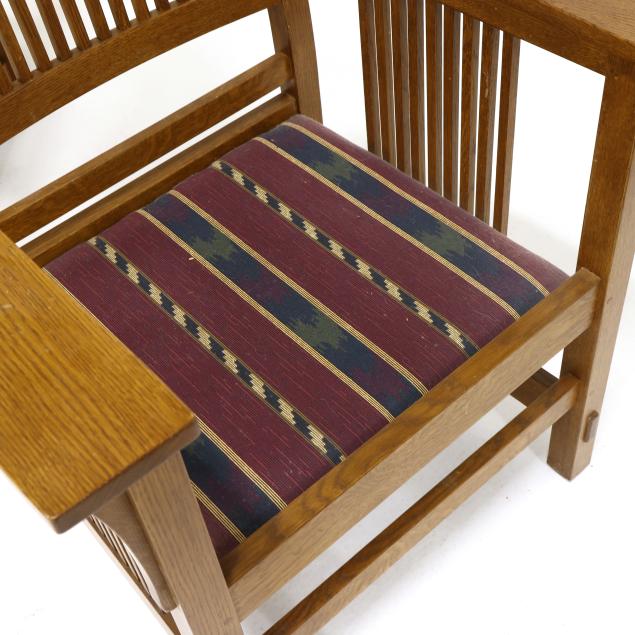 Late 20th century, slat form back, paddle arms, striped upholstered slip seats, arched returns, through tenon stretcher base, labeled.