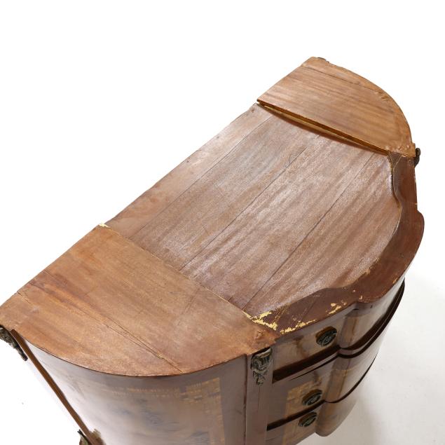 Late 20th-century, shaped marble top with molded edge; king wood, burl wood, and mahogany veneers; three drawers, cabriole legs with ormolu mounts.