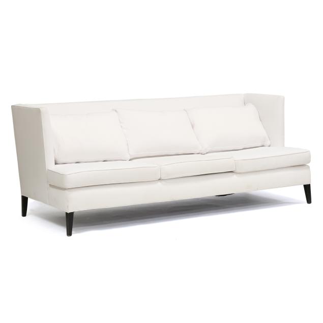 White upholstery with loose cushions, ebonized wood legs, appears unmarked.