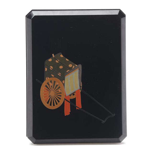 suzuribako (writing box) finely decorated with a Japanese Heian period imperial cart to the cover, the interior decorated with rich