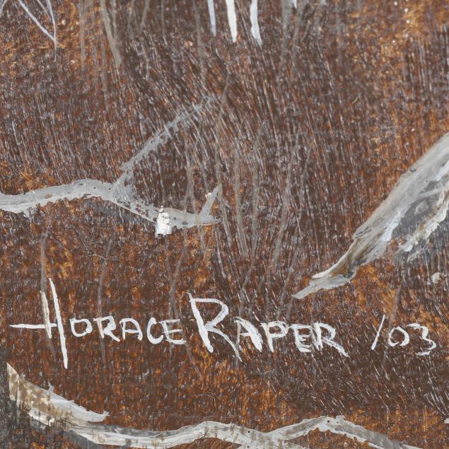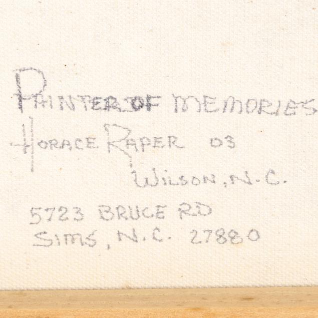 Horace Raper was a self-taught artist and musician based in Wilson, North Carolina, known for his paintings from memory depicting rural life in Eastern North Carolina. His works often featured nostalgic portrayals of the region's landscapes and farming culture. Raper was an active member of the Wilson Active Artists group.