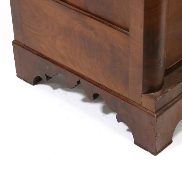 Caswell County, circa 1850, mahogany veneers, poplar and white pine secondary, multi-part form, rectangular dressing mirror with ogee frame supported by a distinctive frame featuring a shaped crest tapered stile supports, fixed to recessed cabinet with two side by side glove drawers and demilune corners, the base featuring a half part white marble molded conforming top above three cockbeaded drawers and featuring book-matched burl mahogany veneers, half round applied columns to the stile, paneled sides, raised on distinctive shaped and cut bracket feet.