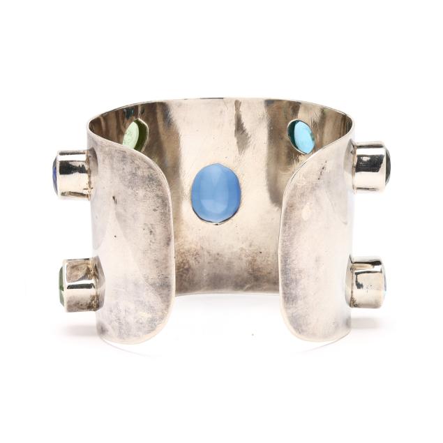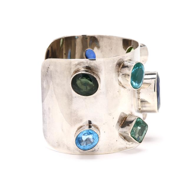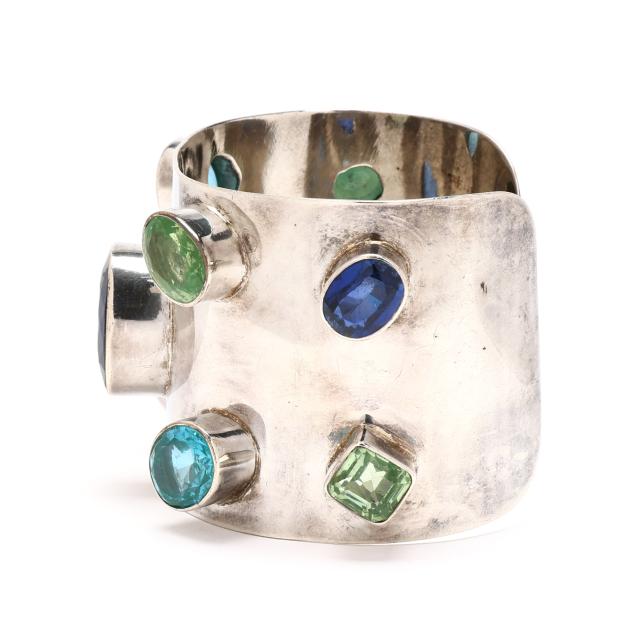 The wide silver cuff bracelet bezel set with oval and square cut synthetic sapphires and synthetic spinels, testing silver.