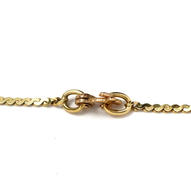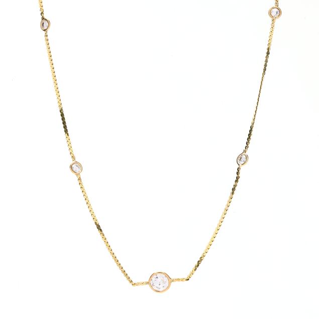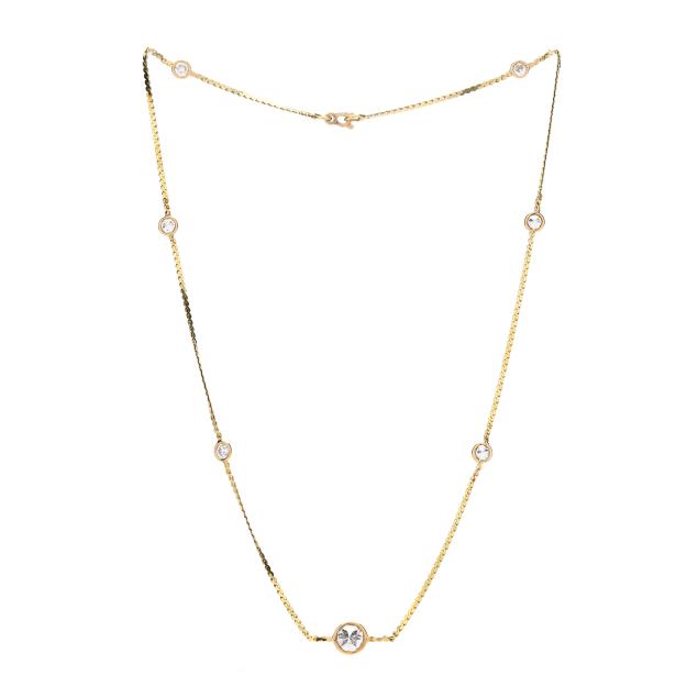 The gold serpentine chain necklace with seven bezel set diamond stations, the center station with a transitional cut diamond (5.8 - 6.0 x 3.7mm) weighing approximately .82 total carat (K color, I1 clarity), with three stations to each side set with transitional cut diamonds weighing approximately .78 total carat (J-K color, SI2-I1 clarity), testing 14KT.