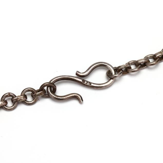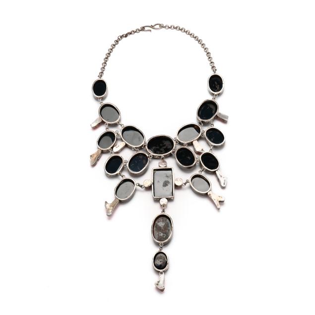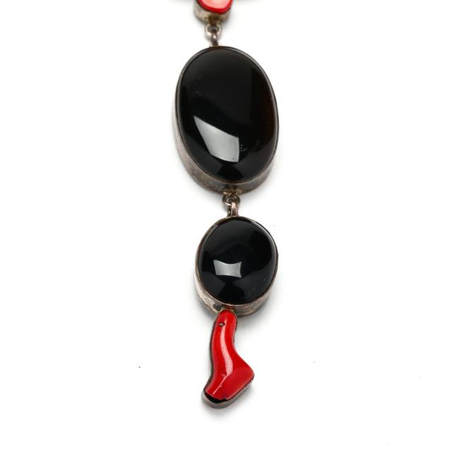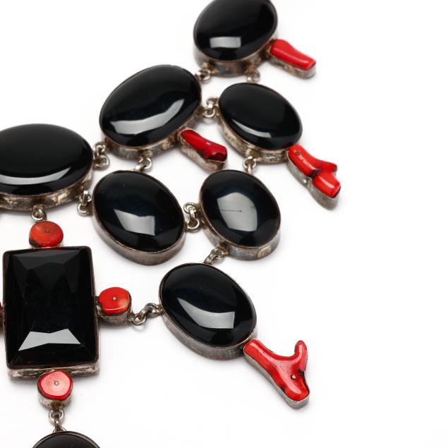 Triangular bib design with bezel set oval and rectangular cut black onyx and with bezel set branch coral, with round link chain connectors and joined to a round link chain completed with a hook and eye clasp, stamped 925.