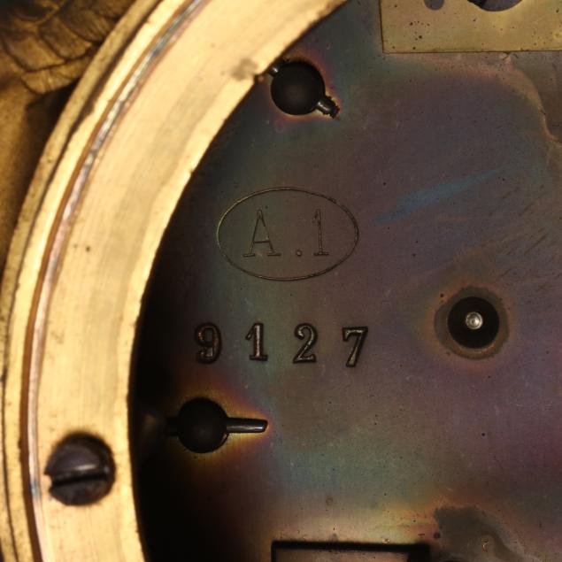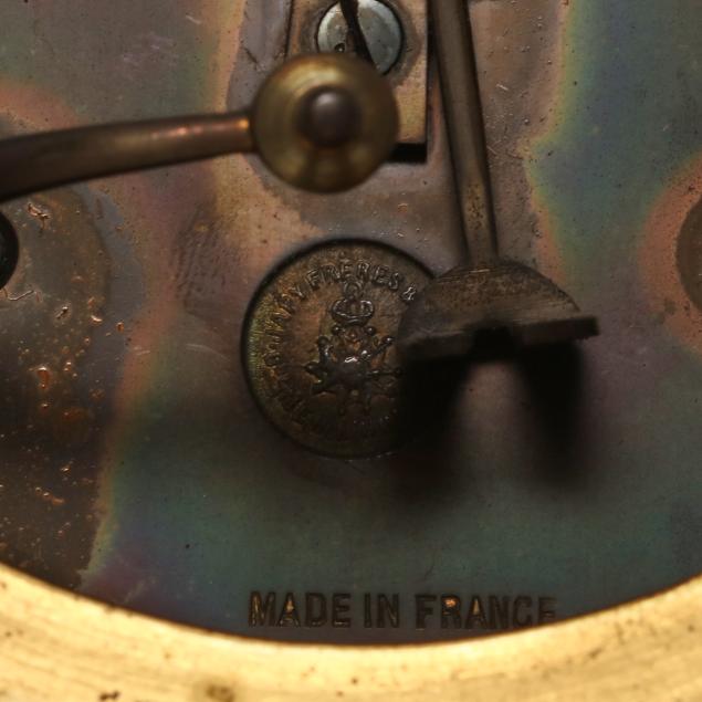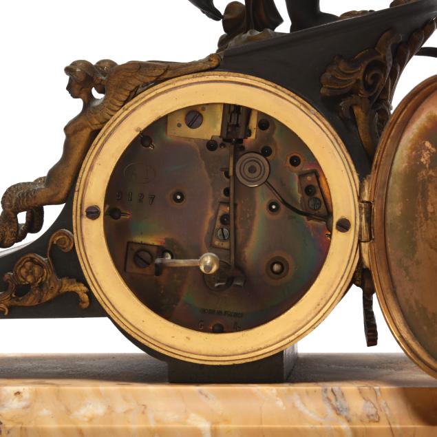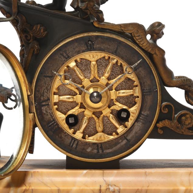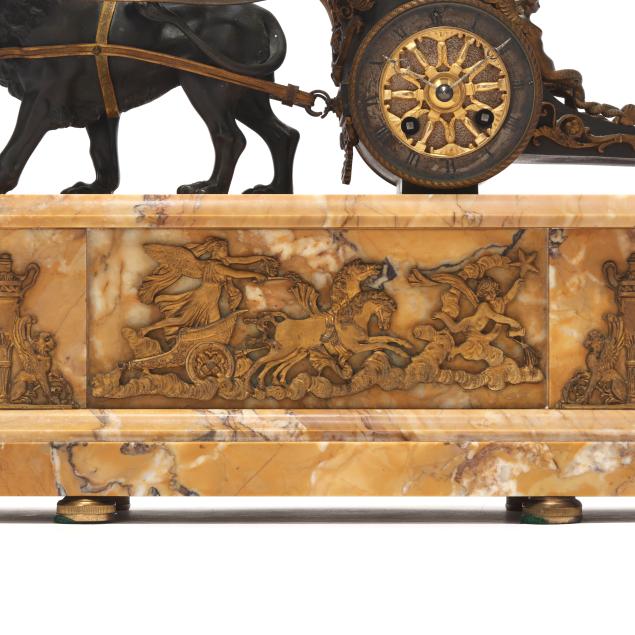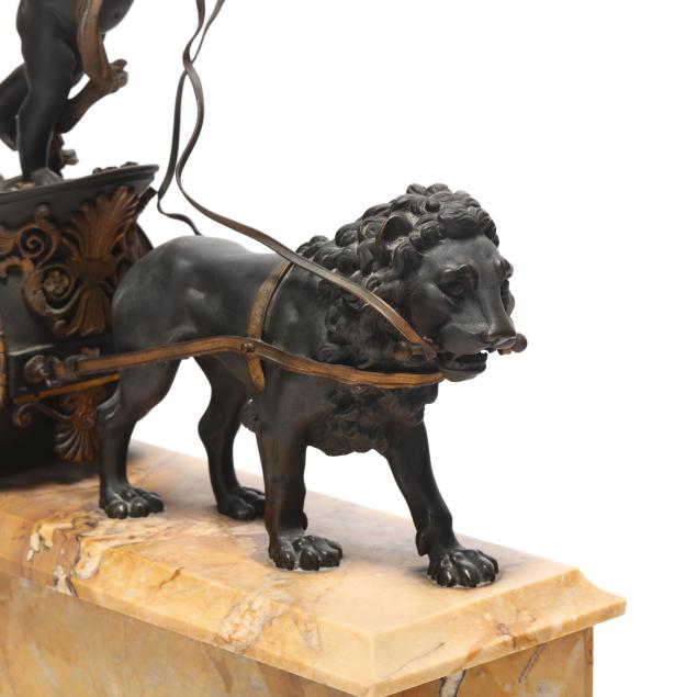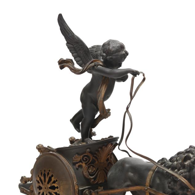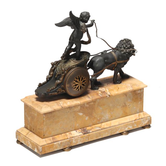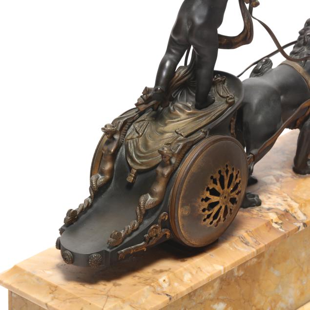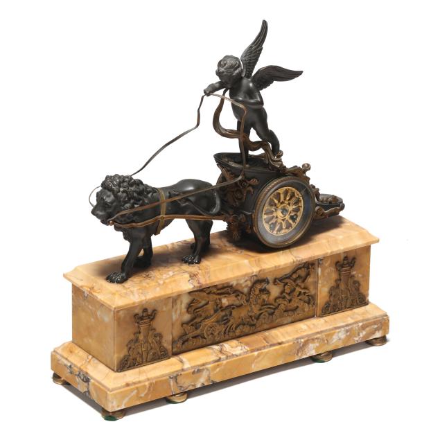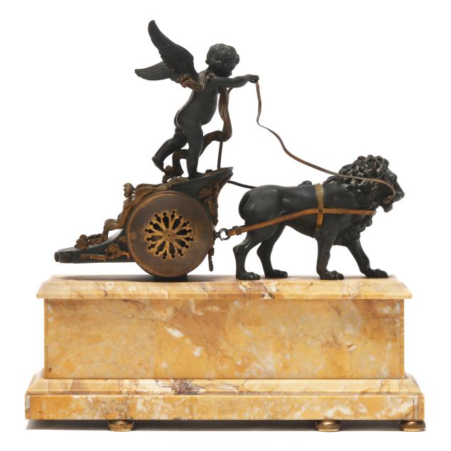 Circa 1870s, manner of Henry Dasson (French, 1825-1896), featuring patinated bronze cherub riding atop a lion-pulled chariot, radial ormolu mounted 3 1/2 in. dial with engraved silvered Roman chapters, the eight day works with suspension spring striking on a bell, the works backplate with medallion mark of "JAPY FRERES & CIE GRD. MED. D'HONNEUR" and stamped "A.1" and "MADE IN FRANCE", resting atop an ochre marble sarcophagus form plinth with Empire style ormolu relief mounts.