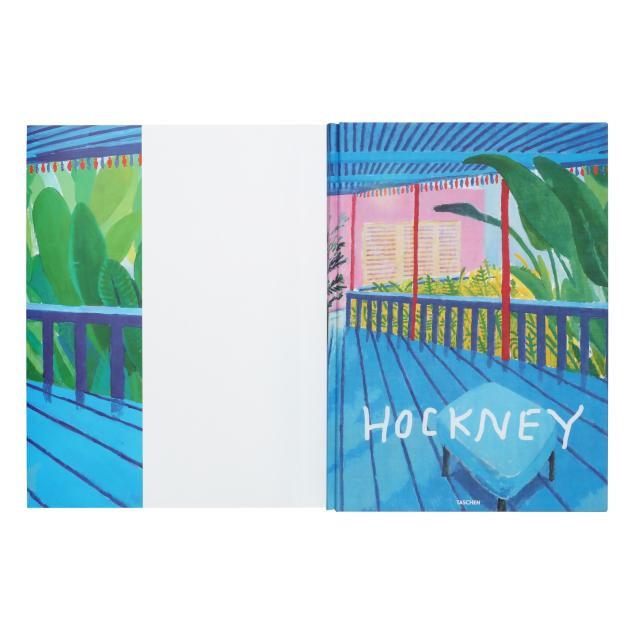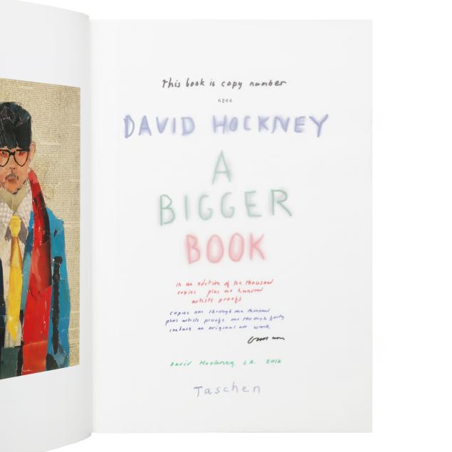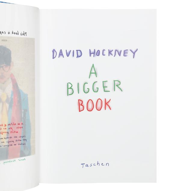 A Bigger Book is a majestic visual survey of David Hockney's art. In it, Hockney takes stock of more than 60 years of work, from his teenage days at art school up to his recent extensive series of portraits, iPad drawings, and Yorkshire landscapes. Never before has Hockney's oeuvre been published in such scope, with such investment from the artist, and on such an astonishing and immersive scale" (https://www.taschen.com/en/limited-editions/art/02641/david-hockney-a-bigger-book/).
