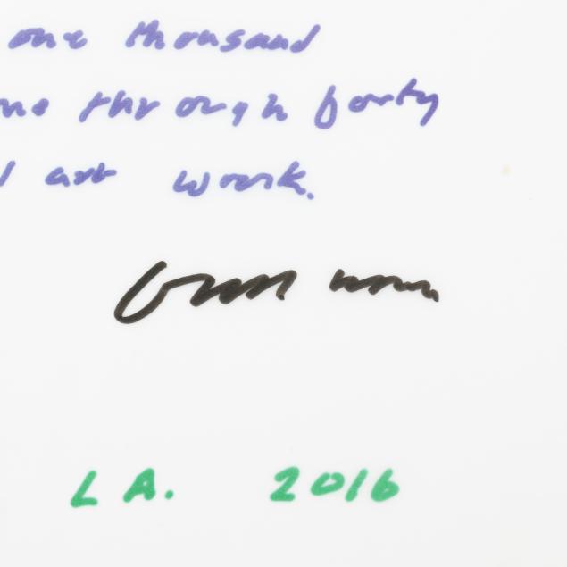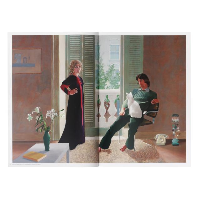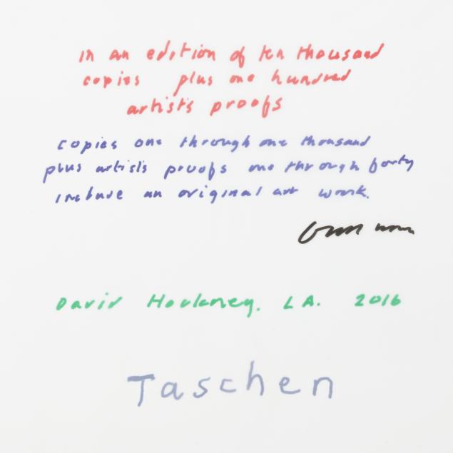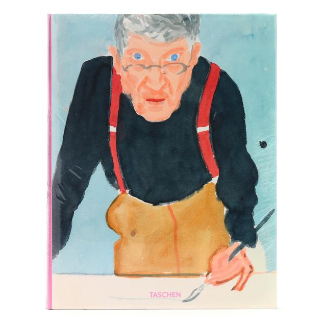 David Hockney — A Bigger Book. Köln, Germany: Taschen, 2016. Limited collector's edition; no. 6266 of an edition of 9,000 copies (from a total of 10,000 copies plus 100 APs). Signed by Hockney on the limitation, as issued. Hardcover. Colorful, illustrated, cloth-covered boards; in pictorial jacket. Sumo-size folio; 498pp. A monograph presenting more than 450 works of art; with (13) fold-outs. Presented on an adjustable tripod book stand designed by Mark Newson with an acrylic tray and aluminum legs in the primary colors, and accompanied by the illustrated 680-page chronology book.