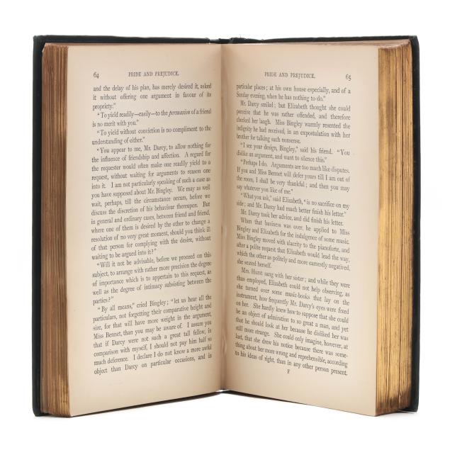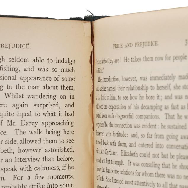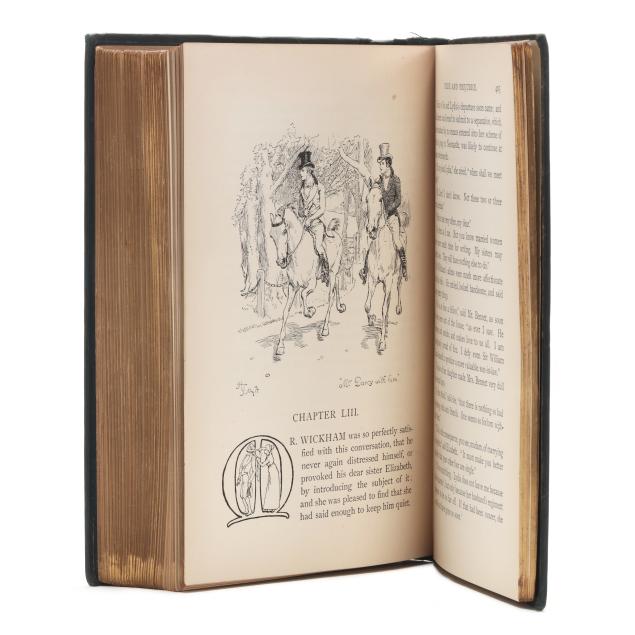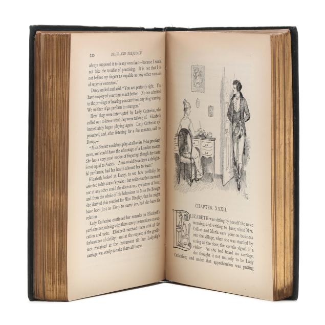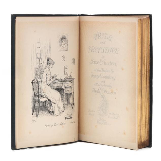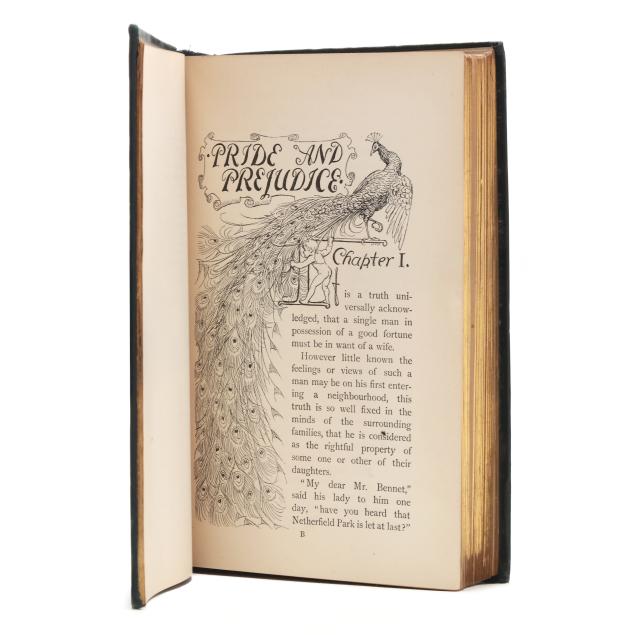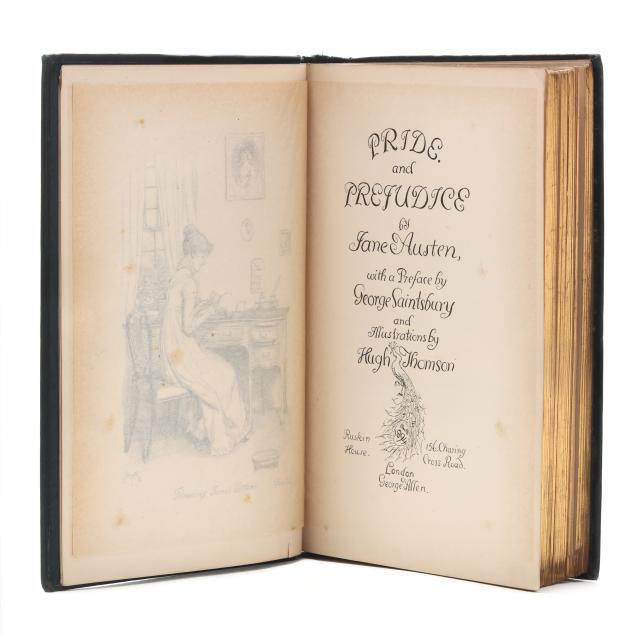 Jane Austen; Hugh Thomson, illus. PRIDE AND PREJUDICE. London: George Allen, 1894. First edition thus; first Peacock edition. Hardcover. Original dark blue/green cloth-covered boards with gilt lettering and the celebrated gilt peacock decoration on the cover and spine, dark blue/green endpapers, and all edges gilt. 8vo; xxvii, [i], [1]-476, [2]pp. With half-title, decorated title page, frontispiece with tissue guard, facsimile inscription, preface by George Saintsbury, numerous line drawings by Hugh Thomson throughout, head- and tailpieces, and ornamental initials. Gilson E78; Keynes 82.