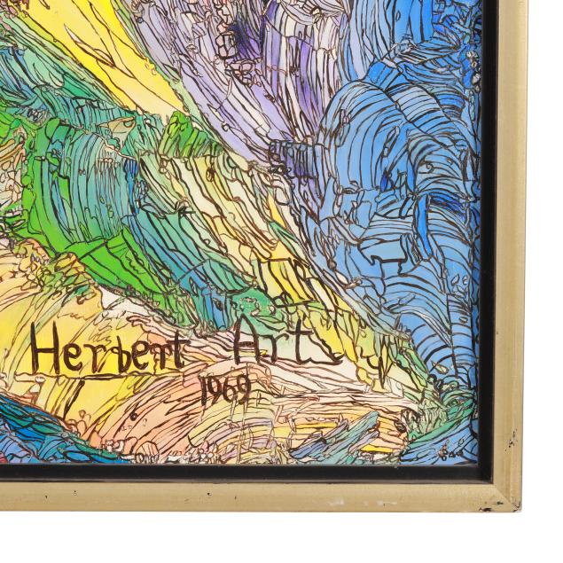 At age 40, Art took up painting as a self-taught hobby. A trip to Italy in 1968, especially visits to mosaic and stained-glass exhibits in Florence, deeply influenced his artistic style. Working primarily in oils, he developed a unique technique he calls “containment of colors,” using a palette knife to create abstract compositions that evoke the look of stained glass or mosaics.