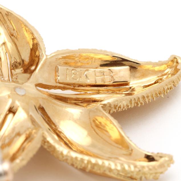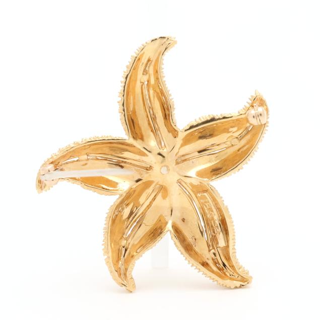The starfish with stippled detailing and centering on a cluster of full cut round diamonds weighing approximately .44 total carat (G-H color, SI1-SI2 clarity), completed with a single locking pin stem, stamped 18K and with maker's mark.