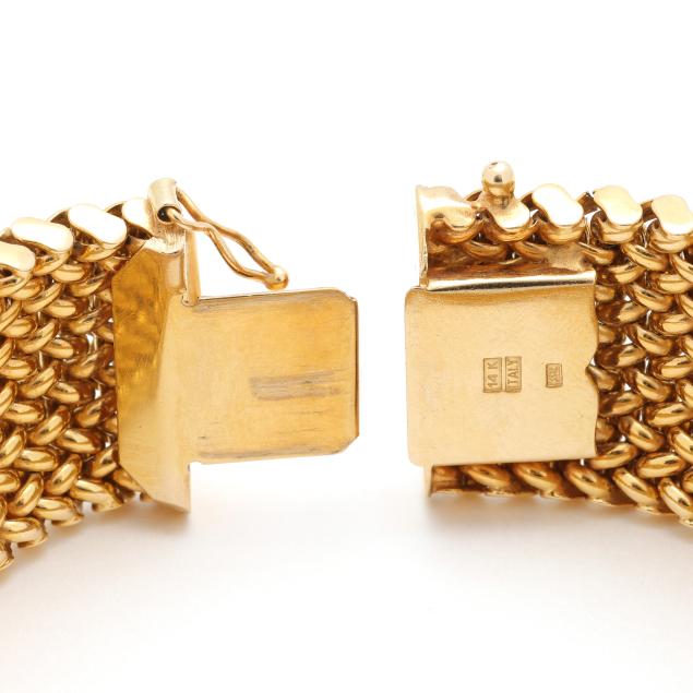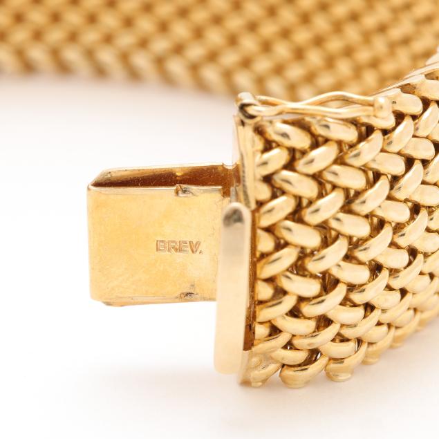Designed in high polish yellow gold in a woven mesh motif and completed with an integrated clasp stamped 14K / Italy / BREV and with a maker's mark.