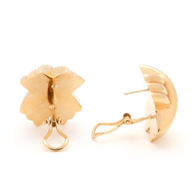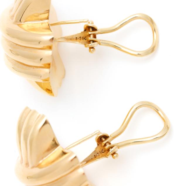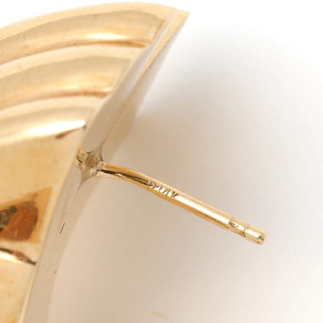 In a fluted X motif and completed with posts and omega clip backs, stamped 14K.