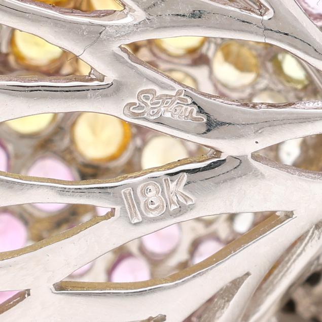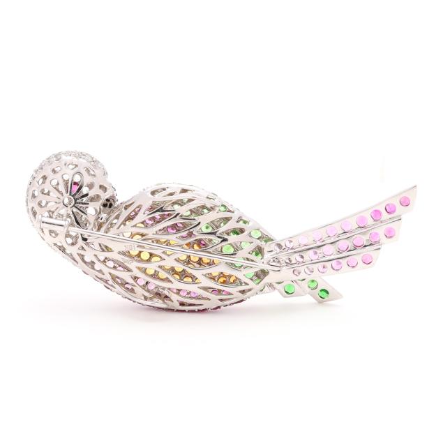 The brightly colored parrot brooch fully set with round cut pink, orange, yellow, and colorless sapphires, with black diamond melee to beak and with tsavorite garnets to the outer wing, with bezel set round cut ruby eye, completed with a single locking pin stem and two bails at center for pendant use, stamped 18K and with a maker's signature.