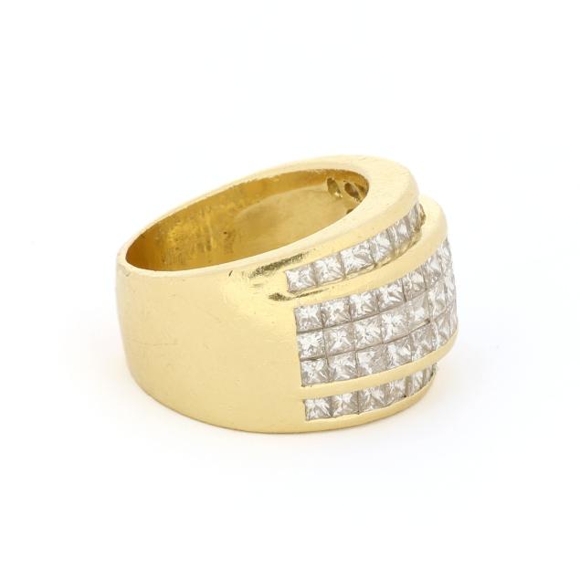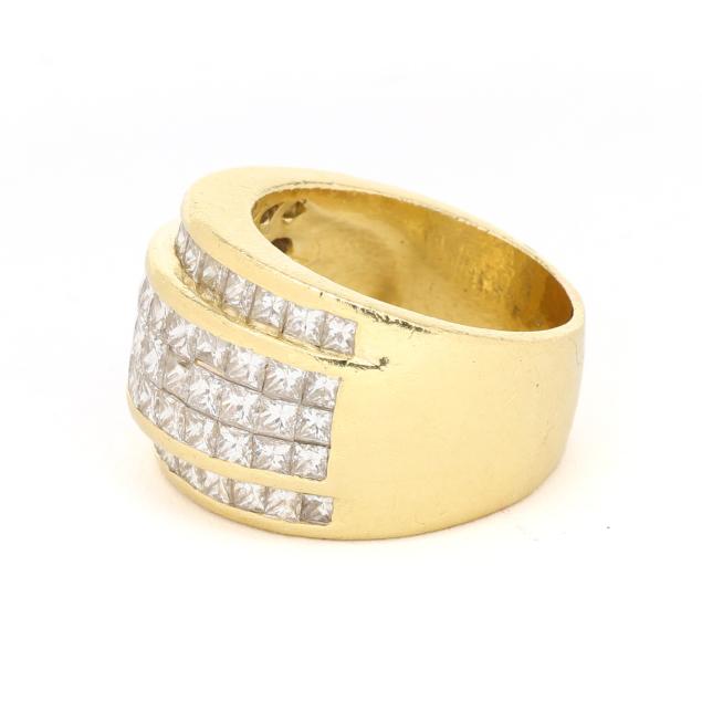 Set to the front with invisible and channel set princess cut diamonds weighing approximately 4.42 total carats (I-J color, VS2-SI1 clarity), on a wide tapering shank, XRF testing 18KT.