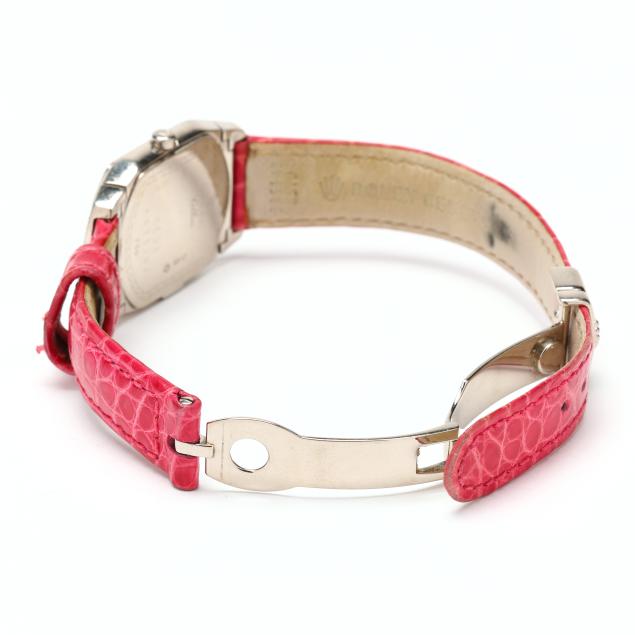Circa 2001, quartz, Rolex 6620, reference number 6693, serial number K695194, the barrel shaped white gold case, pavé set with a double row of single cut diamonds to lugs and bezel, the signed pink dial with Roman numeral hour markers and dauphine hands, the signed pink alligator strap with signed white gold deployant clasp stamped with Swiss hallmarks and 750 / CL / 24803, and signed caseback, numbered and stamped with Swiss hallmarks for 18KT.