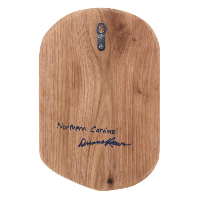 Garner, North Carolina, circa 1980s, hand painted cardinal and foliage on walnut panel signed D. RAVER on the bottom left, marked NORTHERN CARDINAL with signature on back.