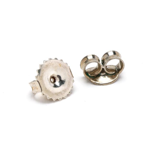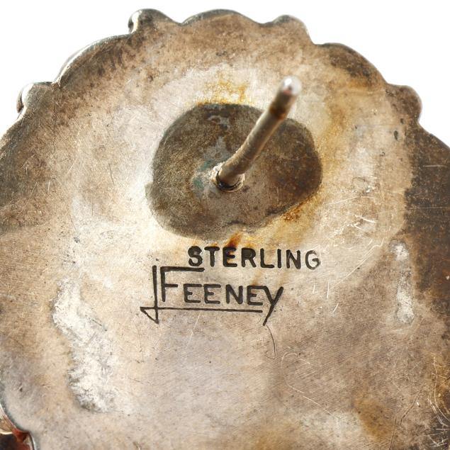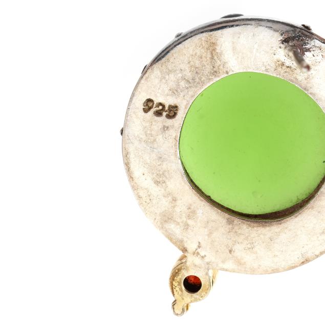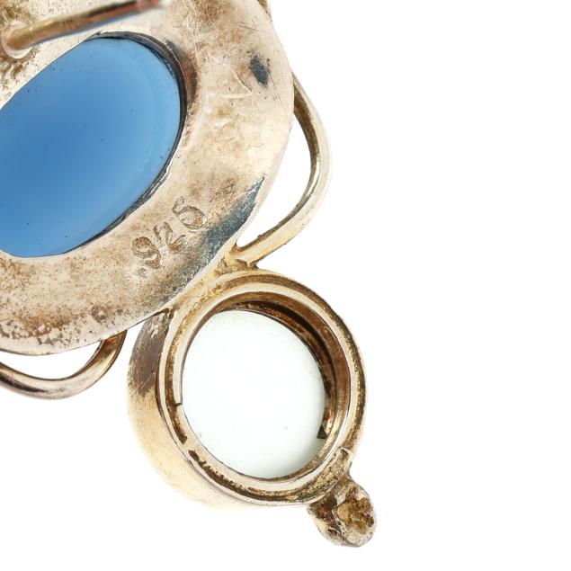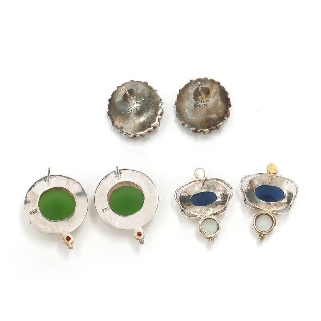 To include: a pair of floral design earrings, centered on an oval cabochon cut pink tourmaline with pear cut peridot surround, completed with a post and friction back, signed LFeeney for Leo Feeney and stamped Sterling (1 x 7/8 in.); a pair of earrings centered on a blue oval cabochon cut glass with textured gold-tone surround, suspending a white round cabochon cut glass, and with a near round pearl surmount, completed with a post and stamped 925 (1.25 x 1 in.); and a pair in circular form, centered on a green round cabochon cut glass with silver surround with star and moon motifs, and with a round cut orange stone drop, completed with a post and stamped 925 (1.25 x 1 in.).