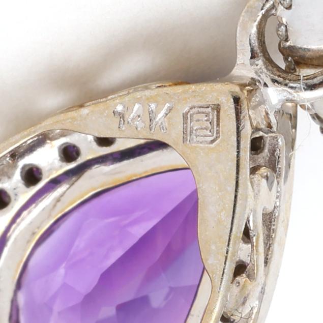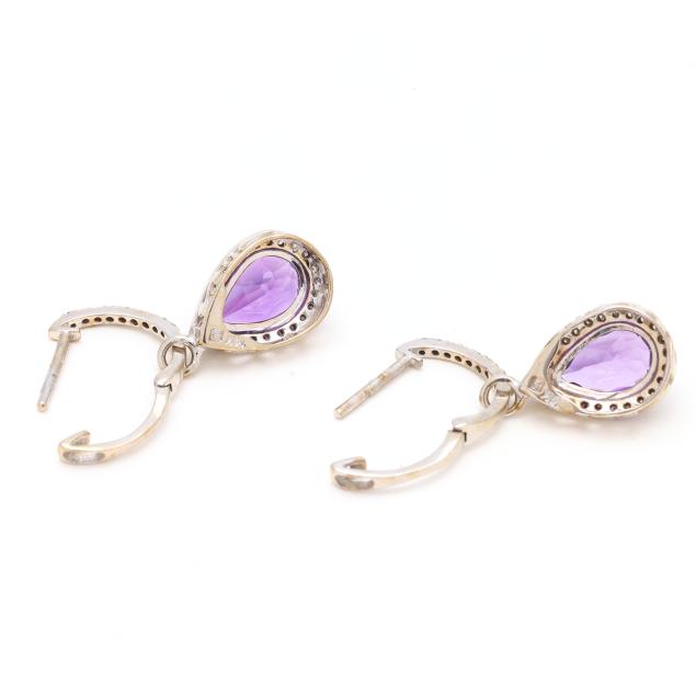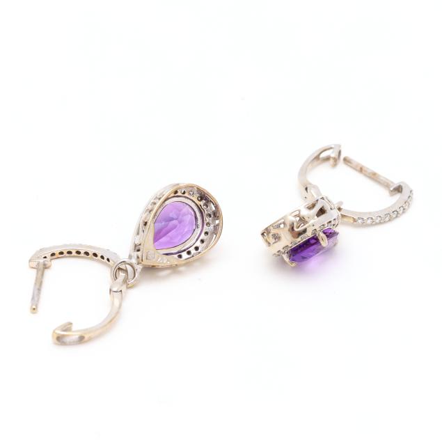 The hoop earrings set with full cut round diamonds, completed with a post and hinged back, and suspending a pear cut amethyst (9 x 6mm) with full cut round diamond surround, stamped 14K and with a maker's mark. The total diamond weight is approximately .34 carat (G-H color, SI1-SI2 clarity).