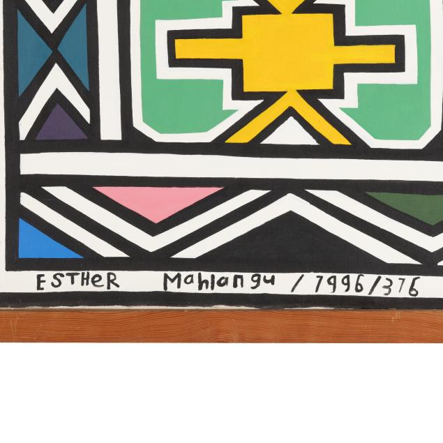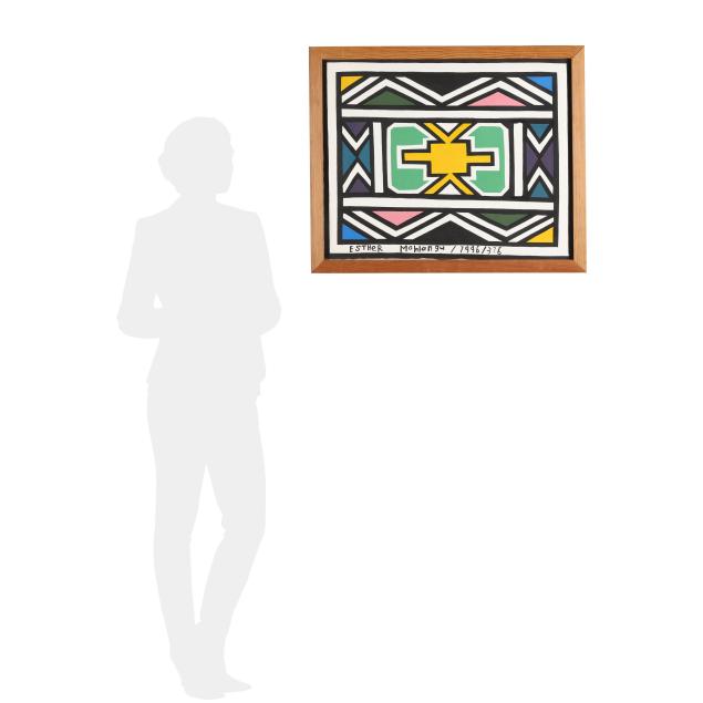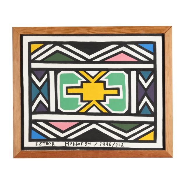 Esther Mahlangu is an internationally acclaimed Ndebele artist celebrated for her bold, geometric compositions rooted in traditional South African wall painting. Born in Middelburg, Mpumalanga, Mahlangu began painting at age 10, learning from her mother and grandmother. Her work is a dynamic evolution of ancestral patterns, meticulously adapted to contemporary surfaces such as canvas, wood, and even automobiles. Mahlangu rose to international prominence in 1991 when she was commissioned by BMW to paint a 525i as part of the BMW Art Car project—becoming the first woman and first African to participate.