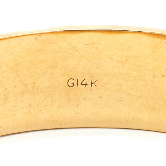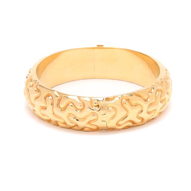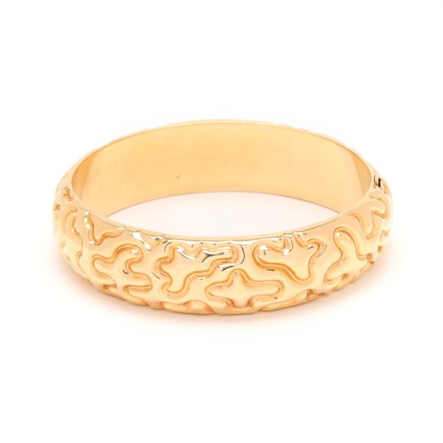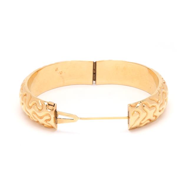 The hinged domed bangle with raised freeform design, completed with an integrated clasp, stamped G14K.