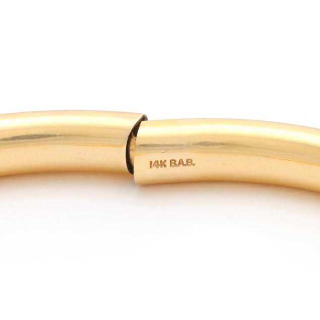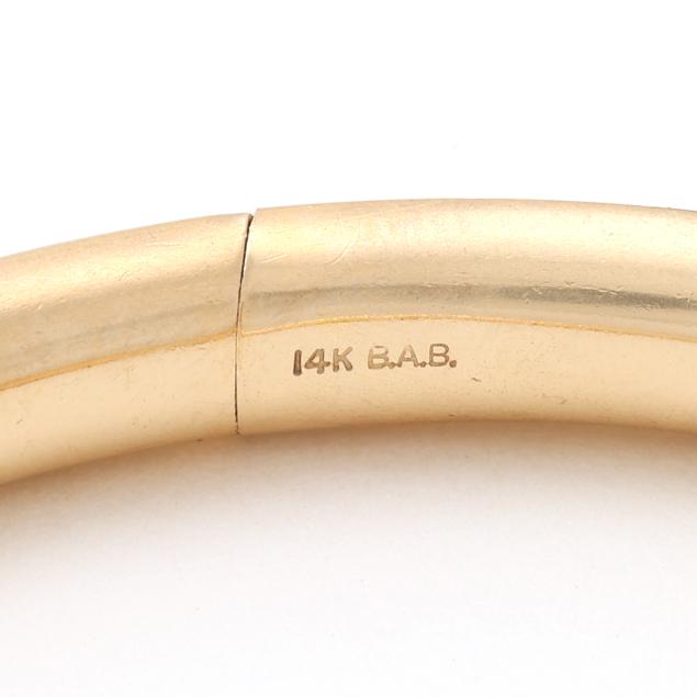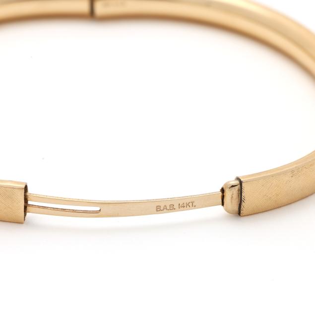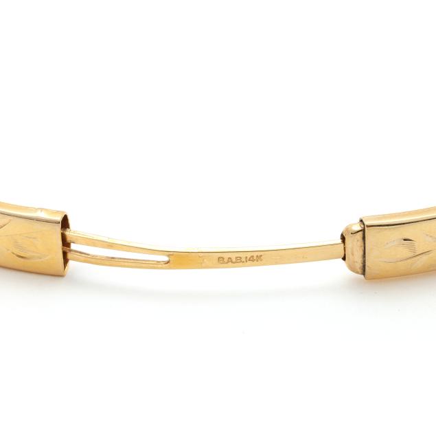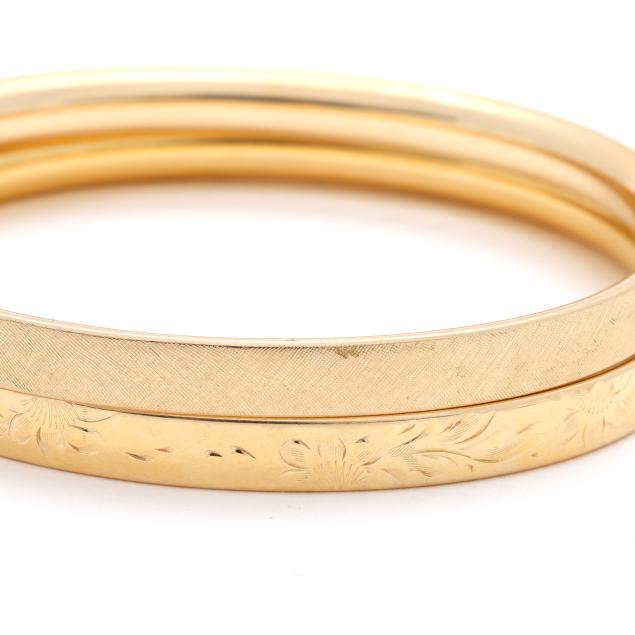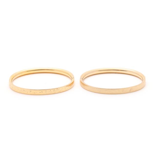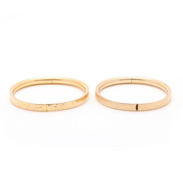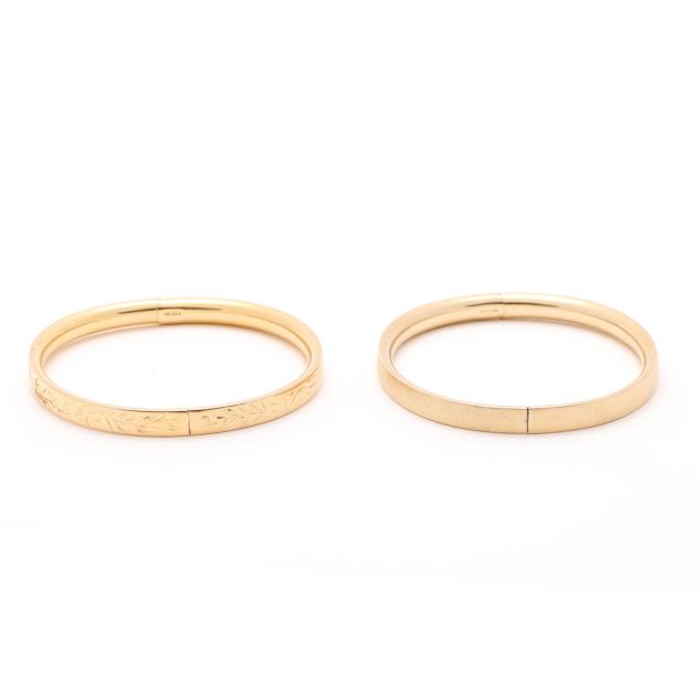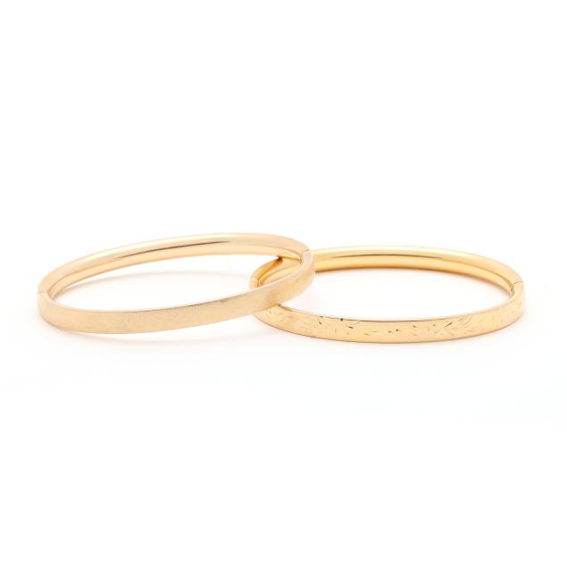 To include: a hinged bangle bracelet with flat top and foliate and floral engraving, stamped 14K B.A.B. (5.6mm; 7 in. interior circumference); and a hinged bangle bracelet with flat top and Florentine finish, stamped 14K B.A.B. (5.6mm; 6.75 in. interior circumference) (with denting).