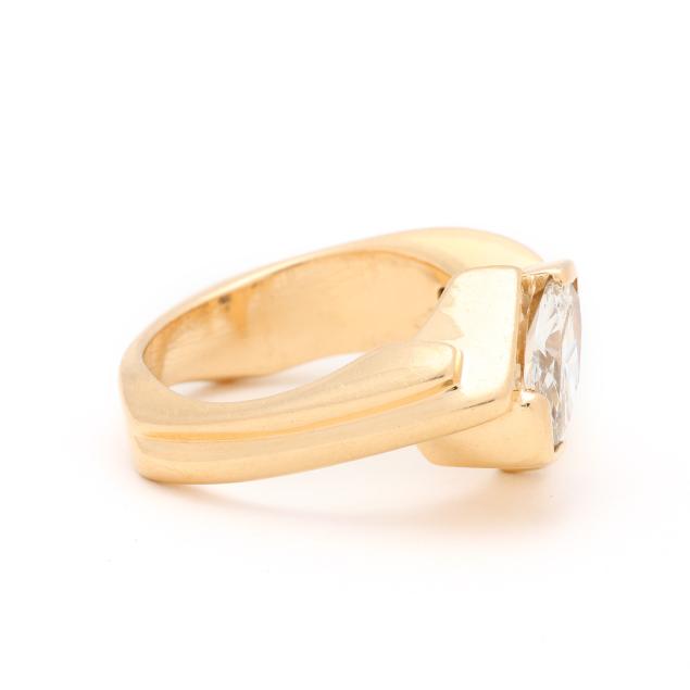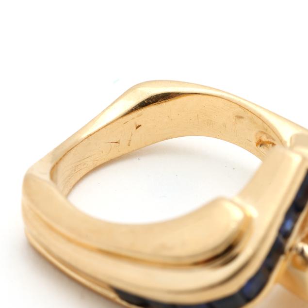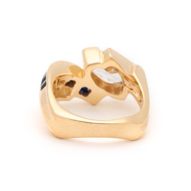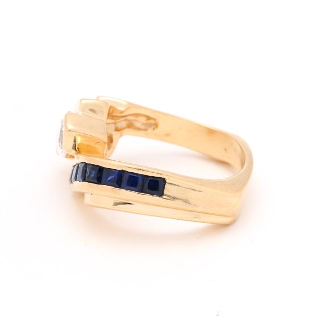 The ring in square form, half bezel set to one side with a marquise cut diamond weighing approximately .90 carat (H color, SI2 clarity), with square cut sapphires channel set to bypass, testing 14KT.