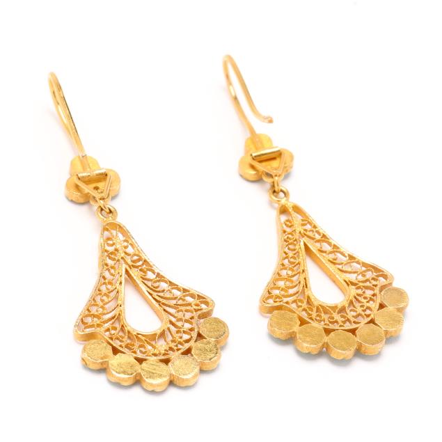 The trefoil surmount set with round cabochon cut turquoise, suspending a filigree dangle set with round cabochon cut turquoise, completed with ear hook and lock, XRF testing 18KT.