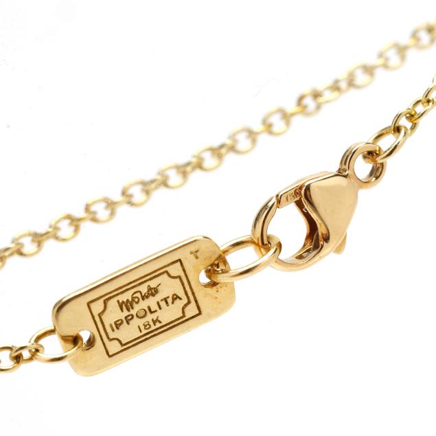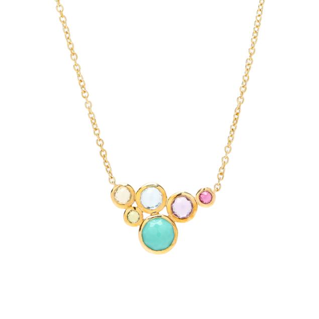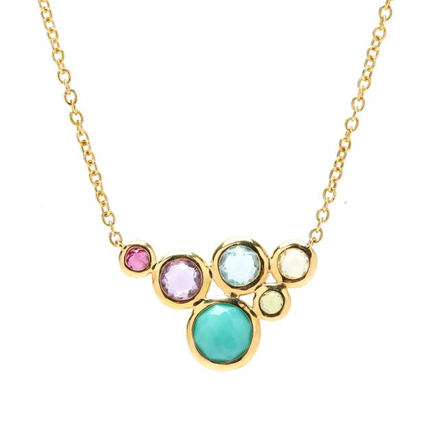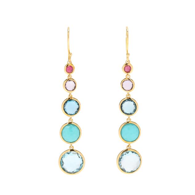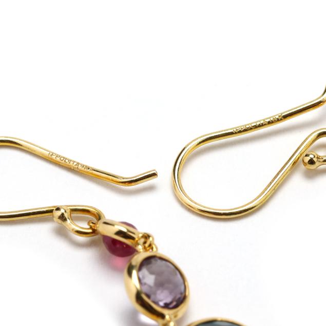 Lollipop collection, the ear wire suspending multiple gemstones to include round faceted blue topaz, turquoise, amethyst, and ruby, each with gold surround, stamped IPPOLITA 18K (2 3/8 in.); and a necklace en suite, with a cluster at center set with round faceted gemstones to include turquoise, blue topaz, ruby, amethyst, and citrine, joined to a cable chain, finished with lobster clasp, signed and stamped IPPOLITA / 18K (18 in.).