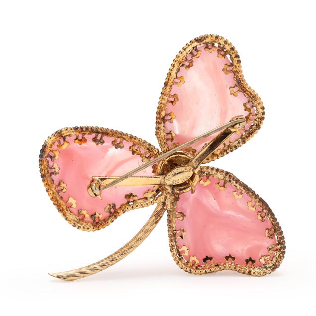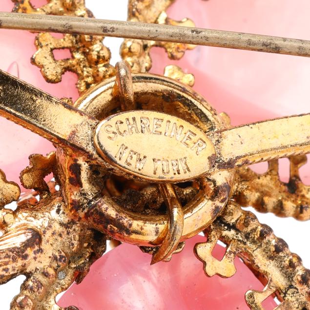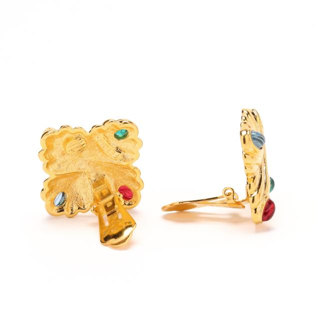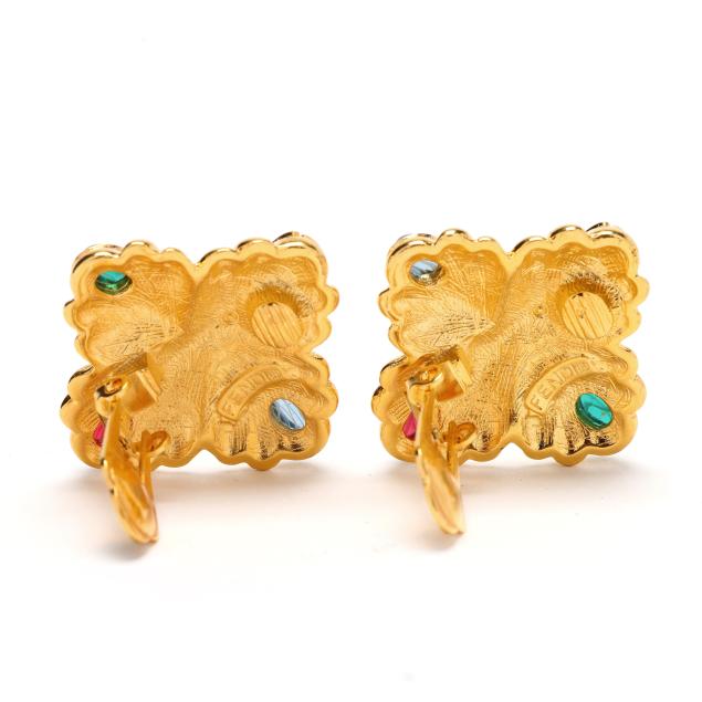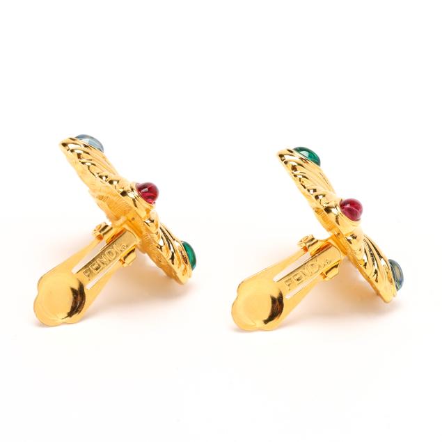 To include: a gold-tone brooch in floral form, set to the center with blue round cabochon cut glass and to the petals in pink freeform cabochon cut glass, completed with locking pin stem and signed Schreiner / New York (3 x 2.5 in.); and a pair of gold-tone earrings in quatrefoil form set to three corners with variously colored oval cabochon cut glass, and to one corner with the Fendi monogram logo, with ridged detailing, completed with ear clip, signed Fendi (1.25 x 1.25 in.).
