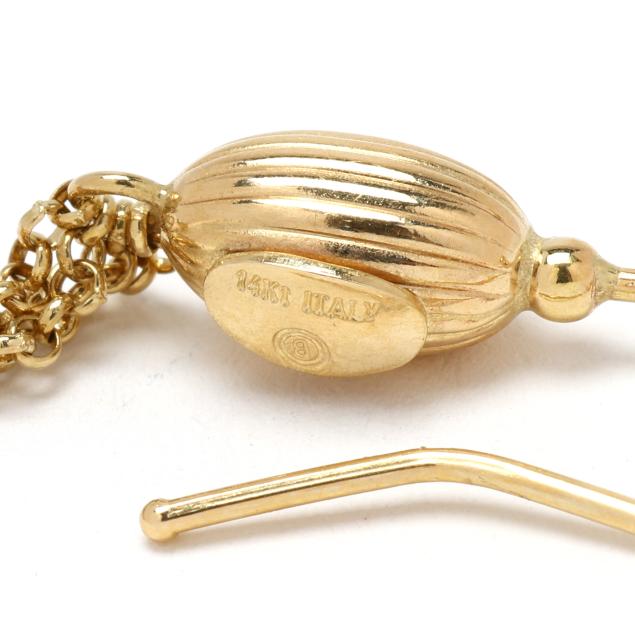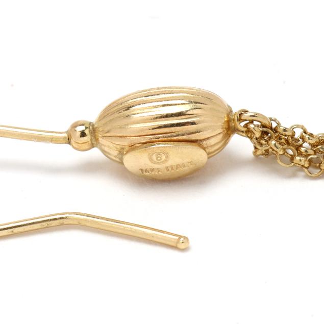 The oval ribbed earring with (4) barrel cut turquoise beads suspended by cable chains, completed with an ear wire, stamped with maker's mark and 14Kt Italy.