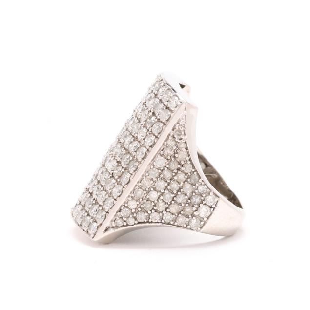 The rectangular top pavé set with full cut round diamonds, and the shoulders pavé set with single cut diamonds, stamped 14K / MDJ. The total diamond weight is approximately 3.00 carats (I-J color, I1-I2 clarity).