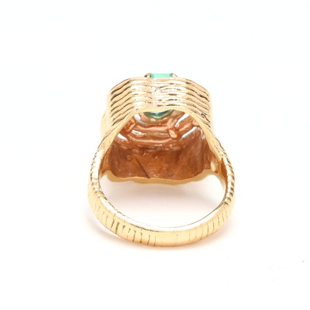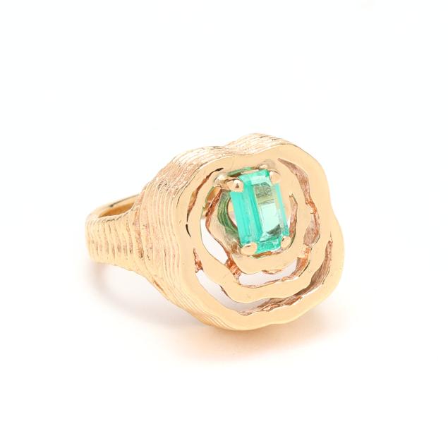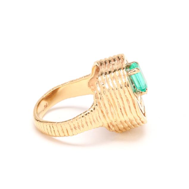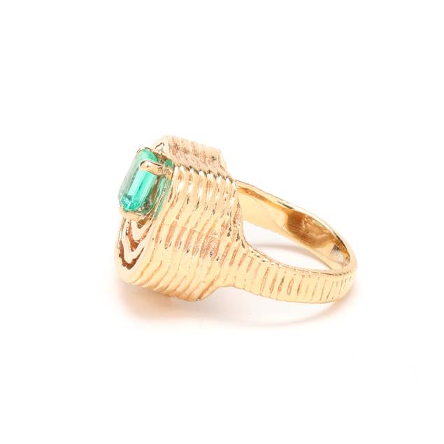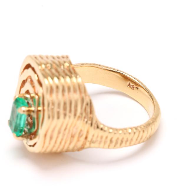The top in a spiral design, set off-center with an emerald cut emerald (5.75 x 3.75mm), with fluted details to surround and shank, stamped with partial 14K.