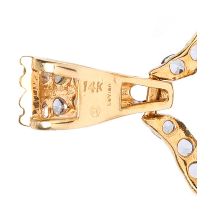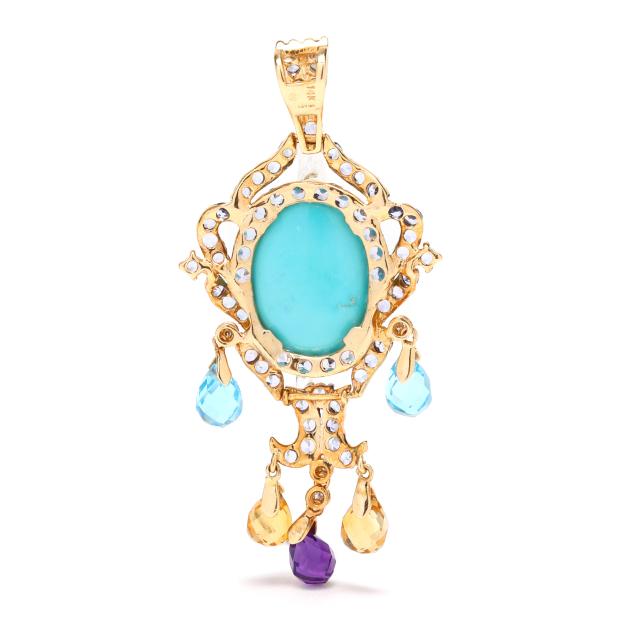 Centered on an oval cabochon cut turquoise (16 x 12mm), set throughout with round cut tanzanite, suspending briolette cut blue topaz, citrine, and amethyst, and with (4) full cut round diamond stations, completed with bail, stamped with maker's mark CV and 14K / Le Vian.