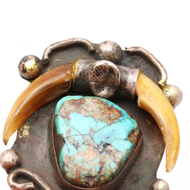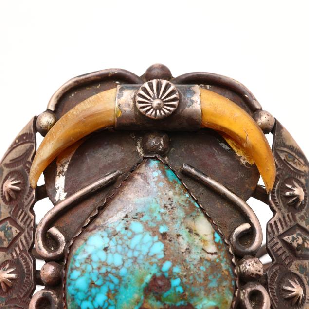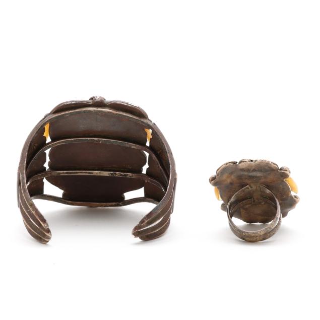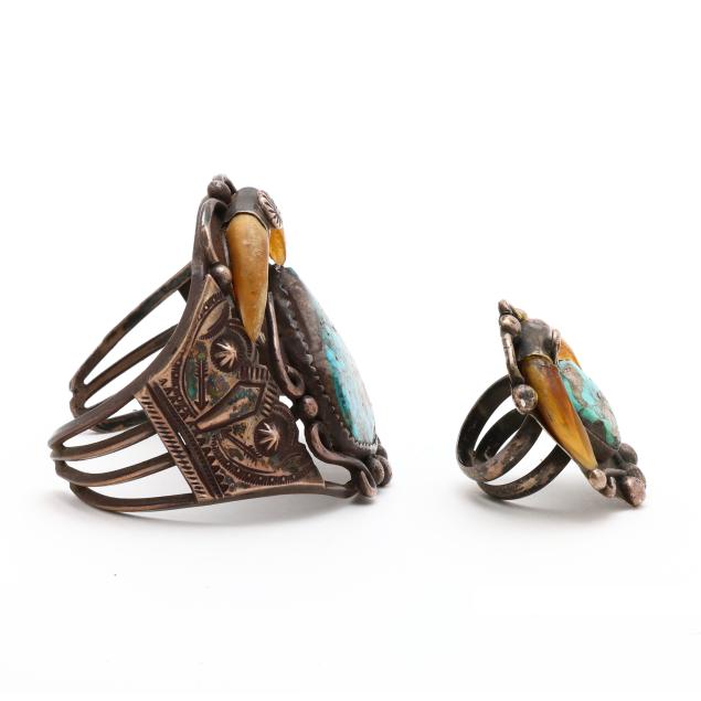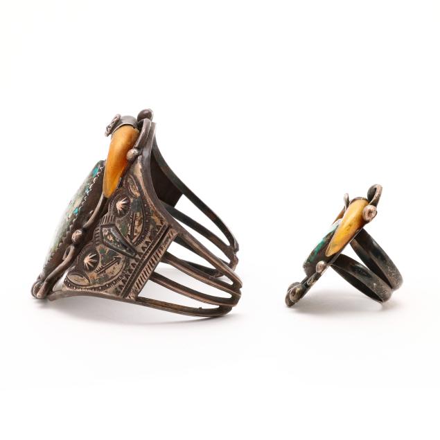 The cuff bracelet centered on a pear shaped turquoise, with claw surmount and engraved detailing to the sides (2.75 in.; 7 in. interior circumference with 1 3/8 in. opening); the ring en suite and centered on a polished turquoise with claw surmount and beaded design (2 x 1.5 in.; ring size 10.5).