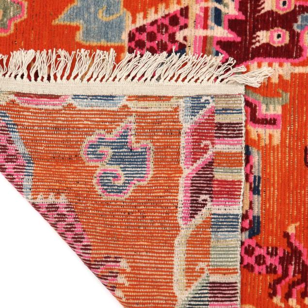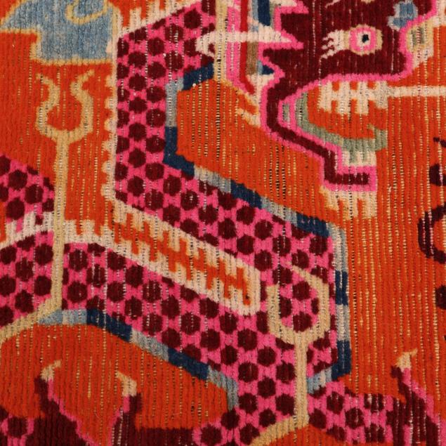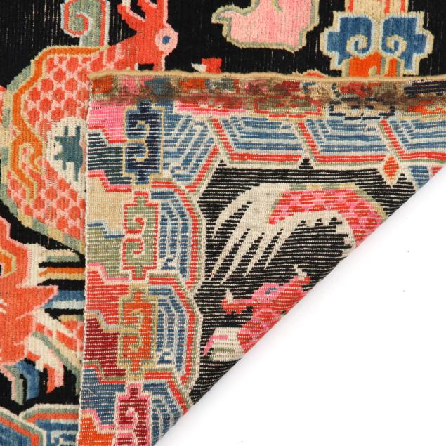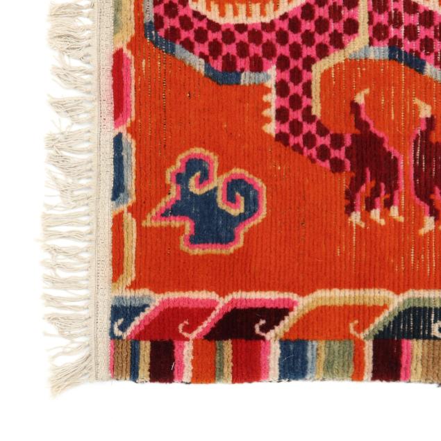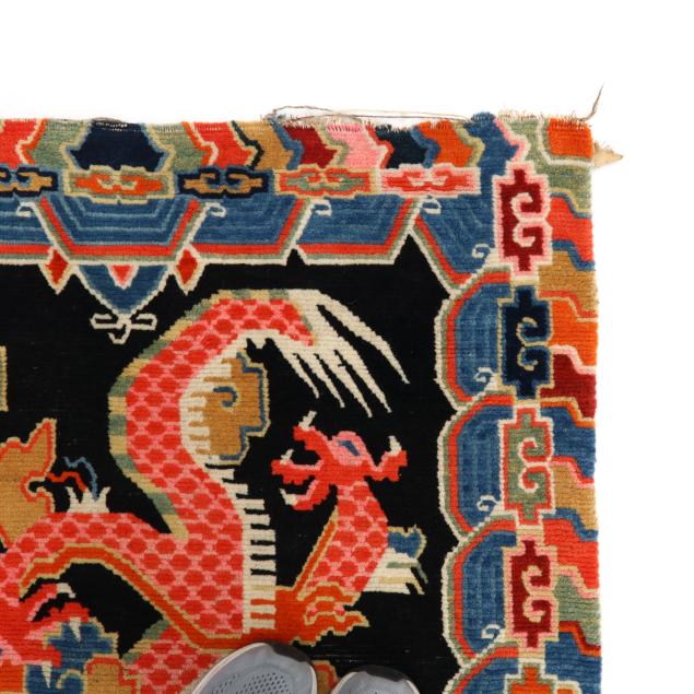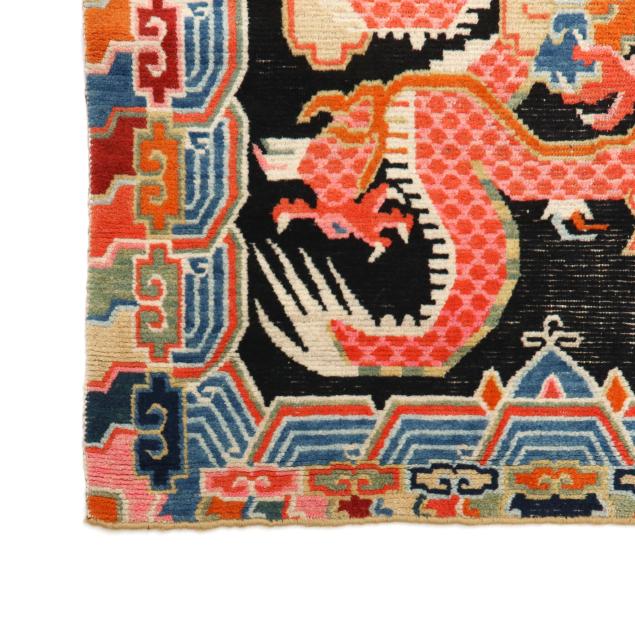 Wool on cotton foundation, the first with bright orange field with colorful dragons and striped borders, with fringe (2 ft. 10 x 5 ft 1) (wear, with areas of exposed foundation, dye run); the second with black field and bright pink dragons with colorful cloud and stripe borders, no fringe (2 ft 11 x 5 ft 7) (wear, with areas of exposed foundation, loss to one end).