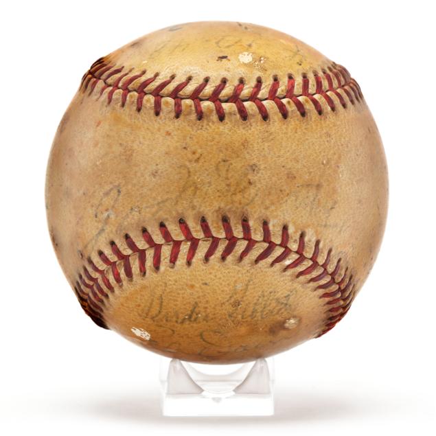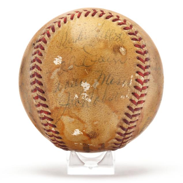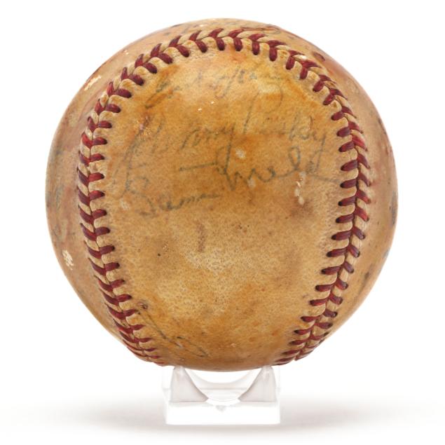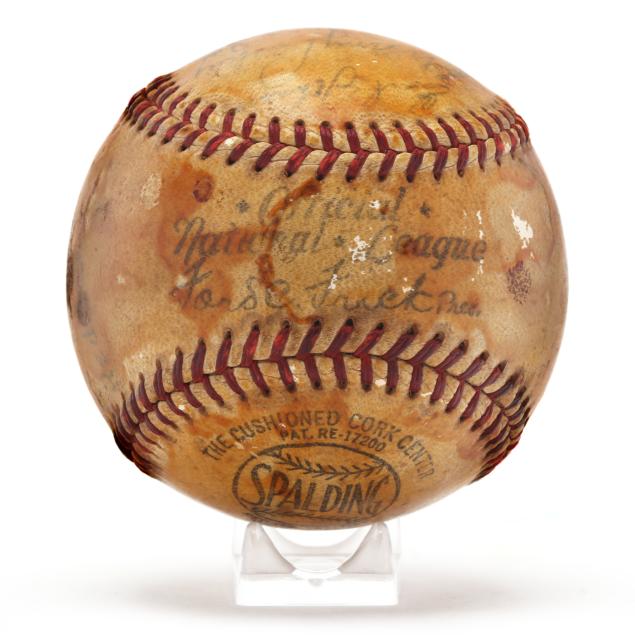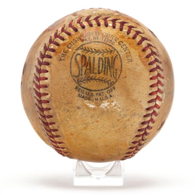 Official National League ball, made by Spalding, one panel with inked date 4-10-48 and the game score "Atlanta 2, Boston Red Sox 13", with ink signatures: manager and Hall-of-Fame inductee