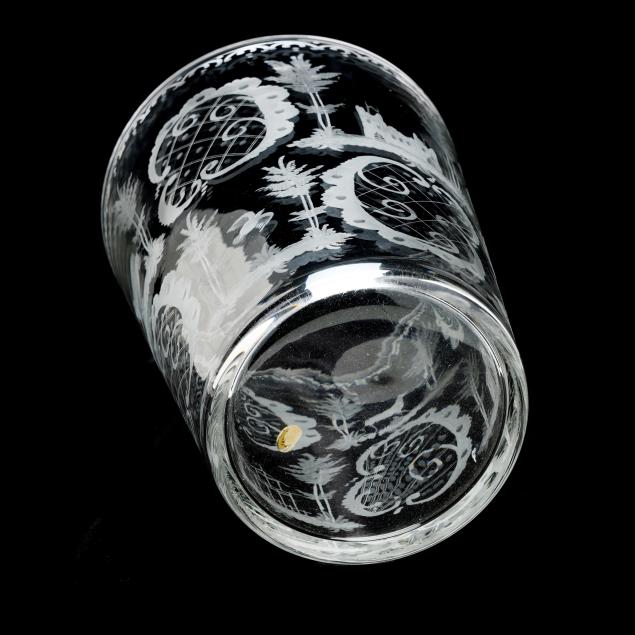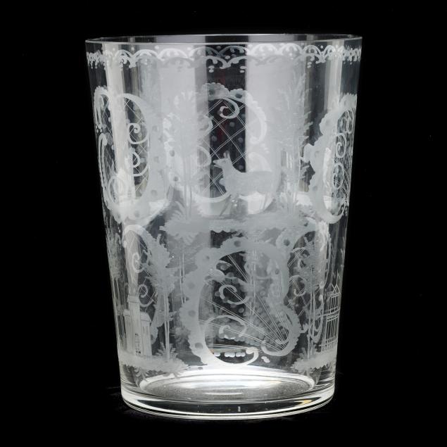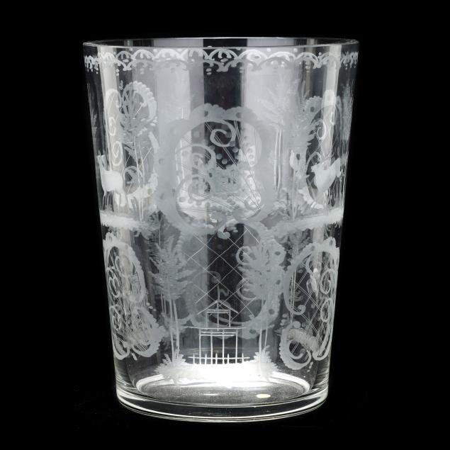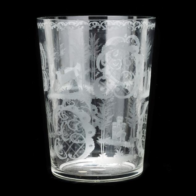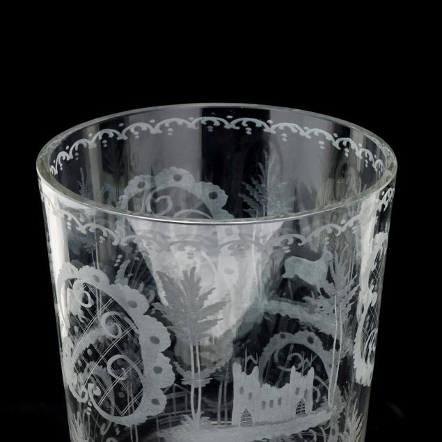 Circa 1900, likely German or Bohemian, tapering form, all over engraving featuring leaping stag, deer, castles and landscapes amidst diapered cartouches, unmarked.