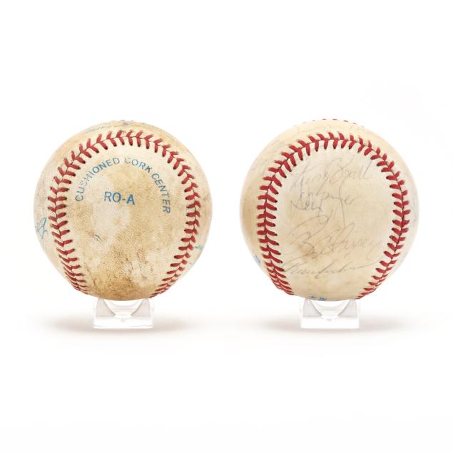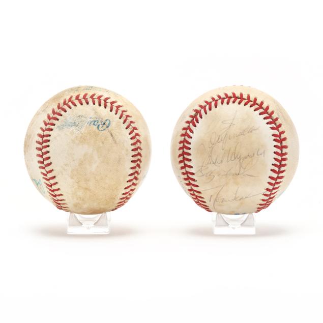 Cards with creases and wear to the edges; balls with toning and some faint signatures.