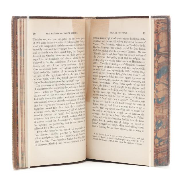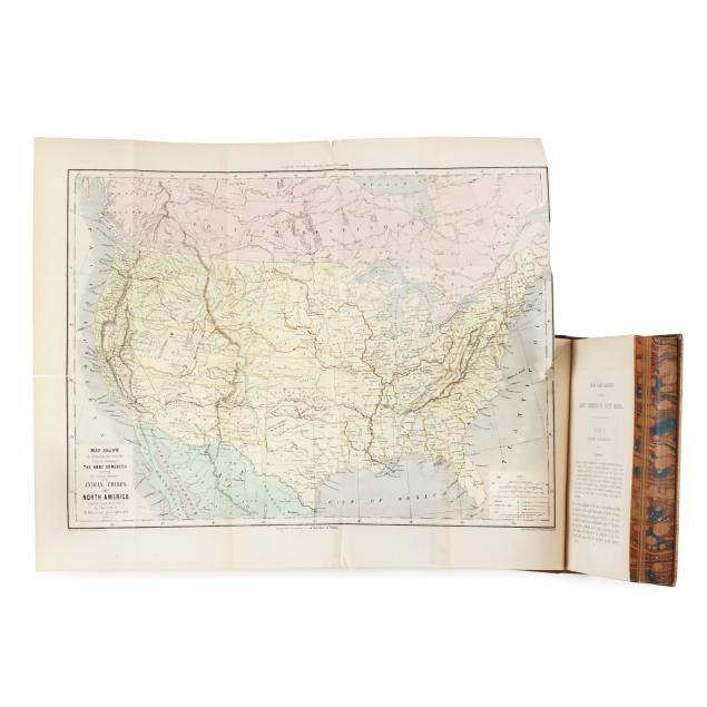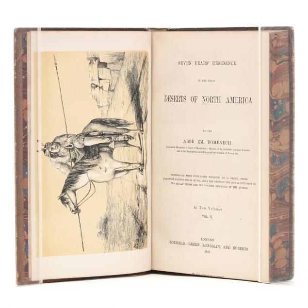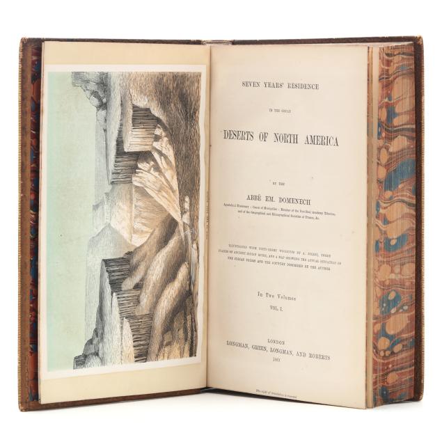 Em[manuel] Domenech. SEVEN YEARS' RESIDENCE IN THE GREAT DESERTS OF NORTH AMERICA. (2) vols. (complete). London: Longman, Green, Longman, and Roberts, 1860. First edition. Full calf with gilt fillet, spine gilt-lettered and decorated with raised bands and red and green labels, with marbled endpapers, all edges marbled, stamp-signed by Jenkins & Cecil. 8vo; xxiv, [1]-445, [1]pp.; xii, [1]-465, [1]pp. With (58) plates including frontispieces, and a folding map. Howes 410; Sabin 20554.