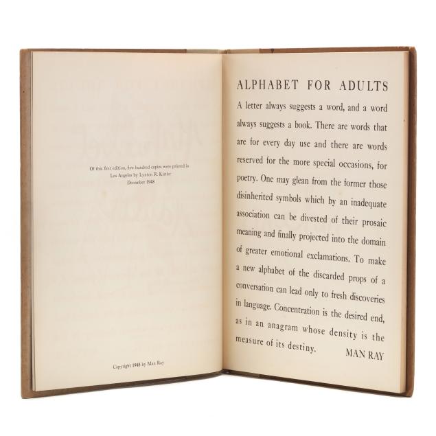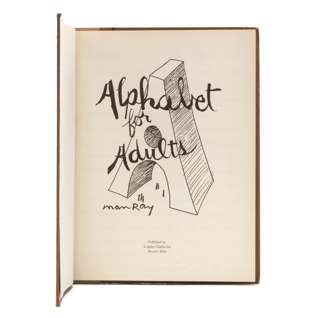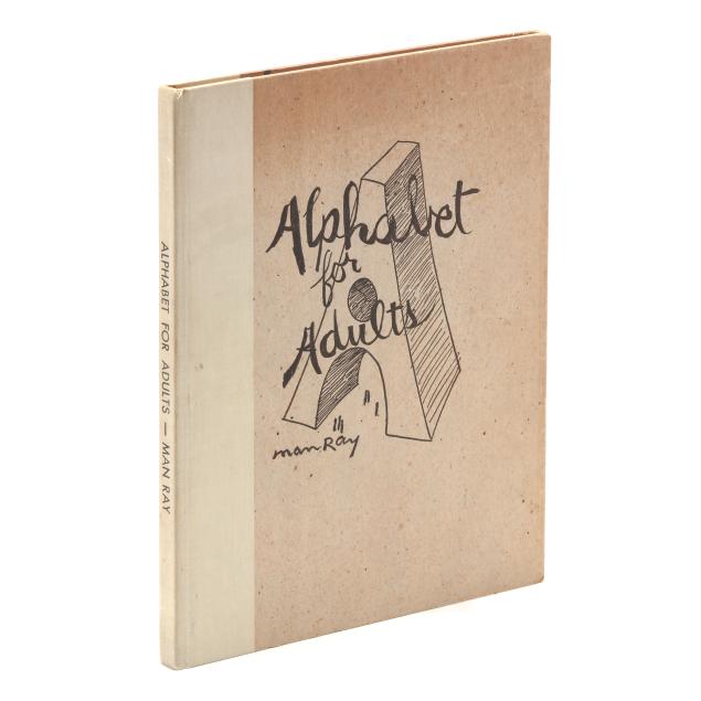 Man Ray. ALPHABET FOR ADULTS. Beverly Hills: Copley Galleries, 1948. First edition. Limited edition; one of 500 copies printed by Lynton R. Kistler. Inscribed by the artist on the front free endpaper: "To Cornelia — / Some adults never grow up .... / you are one of my favorites. / Man Ray 1949." Original beige linen-backed illustrated boards; no dust jacket, as issued. Thin 4to; unpaginated, with title page, one text page, followed by (38) b&w illustrations by Man Ray.