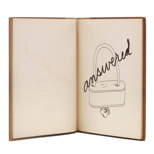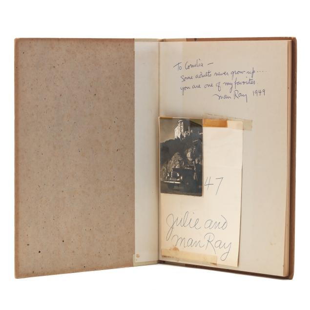 Boards with only light wear including minor scuffing and grime, some sunning, corners bumped, and slight wear to spine ends; mild foxing on the interior of the upper board and an occasional spot on a couple of leaves; ghosting on free endpapers; leaves extremely clean. A single sheet dated "1947" and labeled "Julie and / Man Ray" taped to front free endpaper, with the photograph attached to the sheet with two pieces of tape at the upper edge subsequently impacting the image but not the inscription on the verso. A beautiful copy of the book; better than most, and easily very good.
