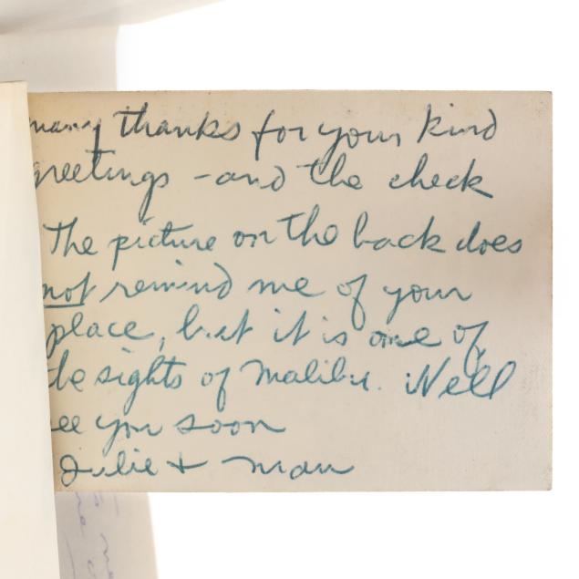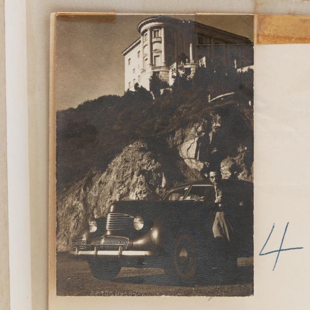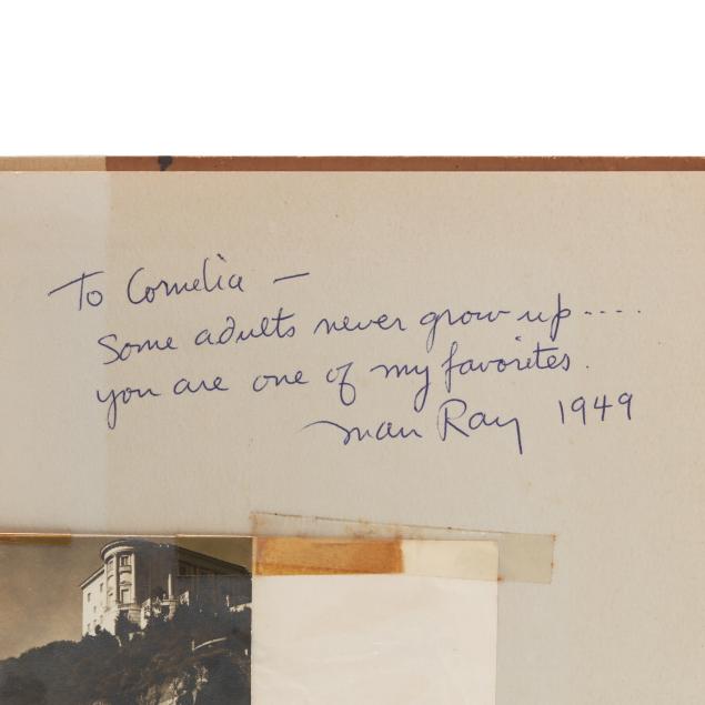 Also included with the book is a small photograph (3 3/4 x 2 5/8 in.) depicting Man Ray in the foreground next to his metallic blue Graham-Paige Hollywood Supercharged sedan parked along the Pacific Coast Highway, with the Villa de Leon in the background, 1940s, inscribed on the verso: "many thanks for your kind / greetings - and the check / The picture on the back does /