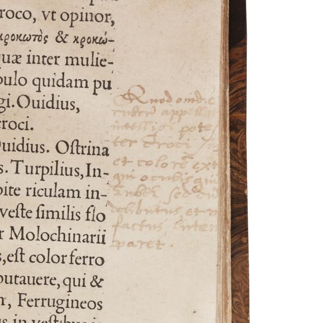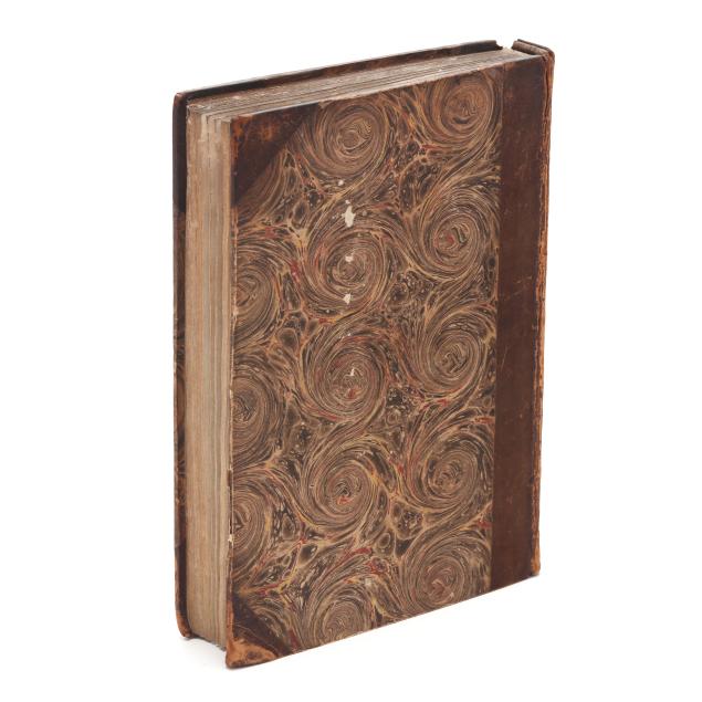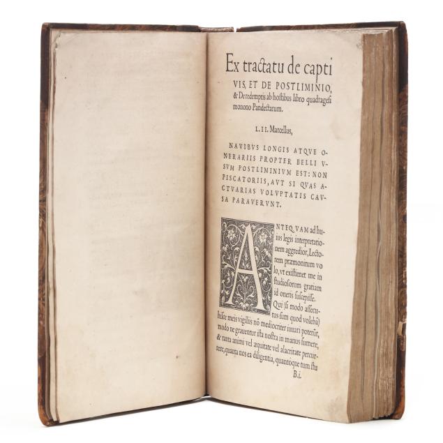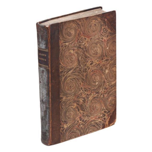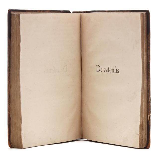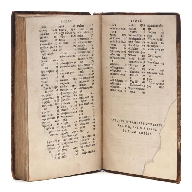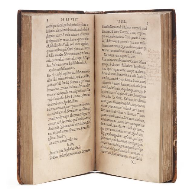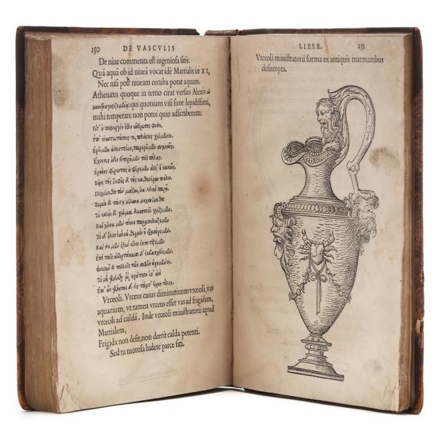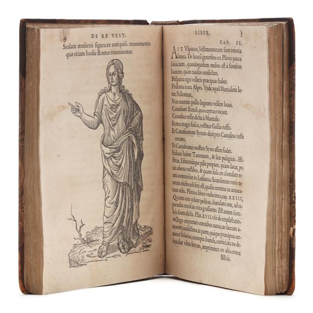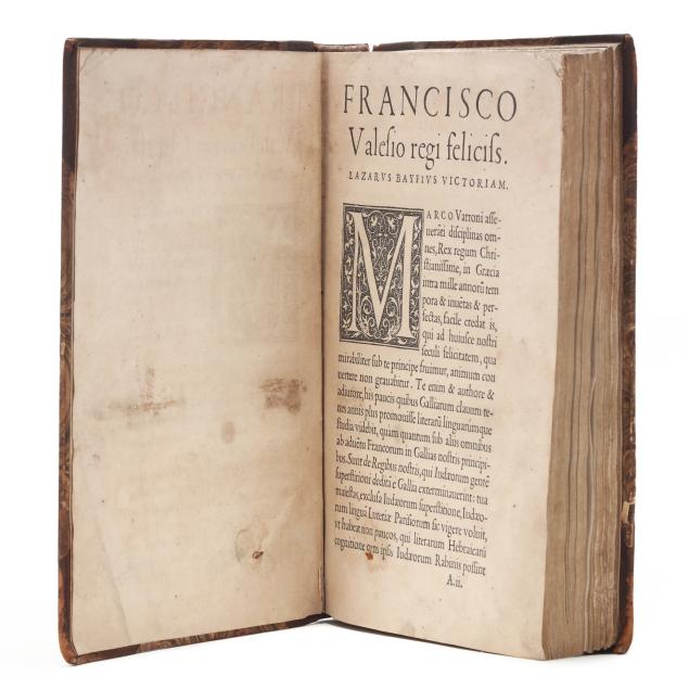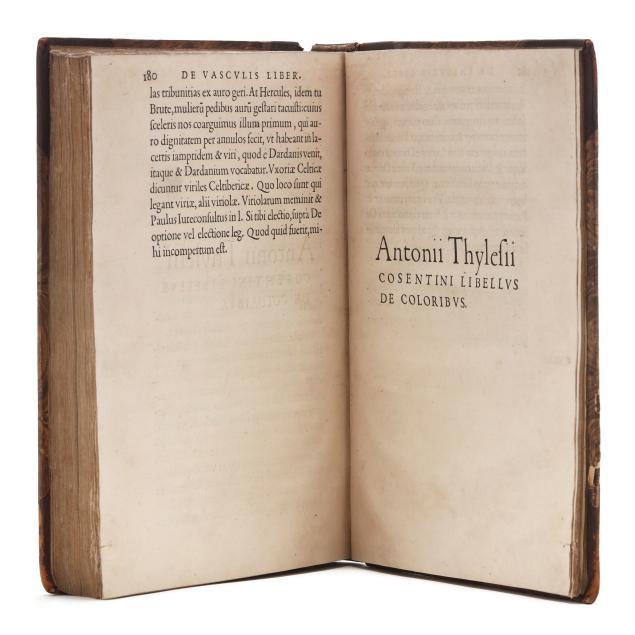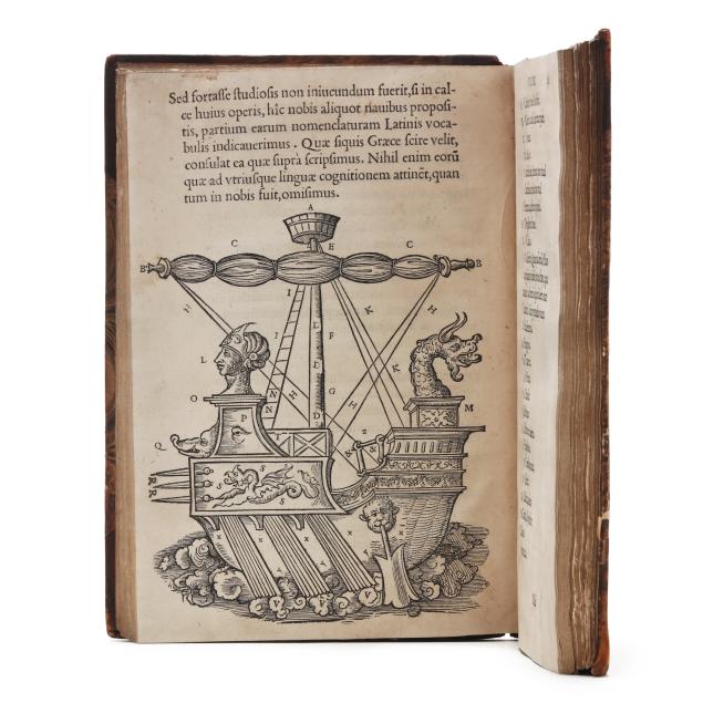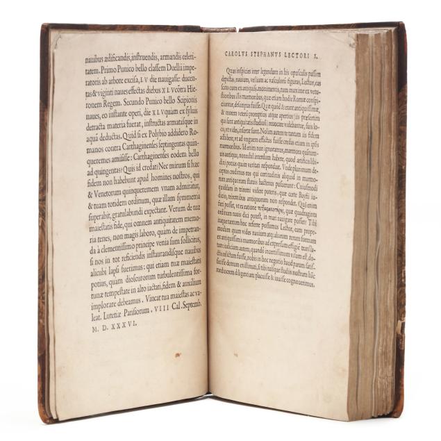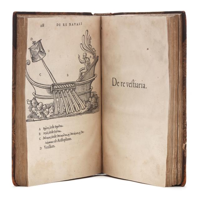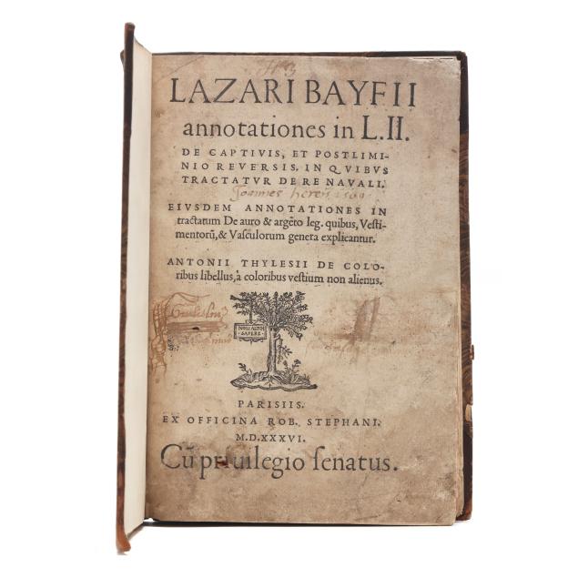 Lazare de Baïf; Antonio Telesio; Charles Estienne, ed. LAZARI BAYFII ANNOTATIONES IN L.II. DE CAPTIVIS, ET POSTLIMINIO REVERSIS. IN QUIBUS TRACTATUR DE RE NAVALI [and three other works]. Paris: Ex Officina Rob. Stephani [Estienne], 1536. First printing of this collection of texts. Rebound in half leather over marbled paper-covered boards, spine with gilt-stamped label, with fresh endpapers. 4to; A4 B-L8 M4 2A-2B4 2C-2P8; [8], 168, [8], 203, [13index]pp. (with the typical errors in pagination). The volume contains several texts, including Baïf's writings on naval affairs (De re navali), ancient dress (De re vestiaria), and vessels (De vasculis), and ending with Telesio's De Coloribus, the first published monograph on colors. With numerous woodcuts, many full-page, of ships, jars, and more that Charles Estienne explains at the start of the volume come from ancient monuments; with printer's device on the title page, decorated initials, and final errata. Text in Latin and Greek. Renouard 44.19; STC French, p. 39.
