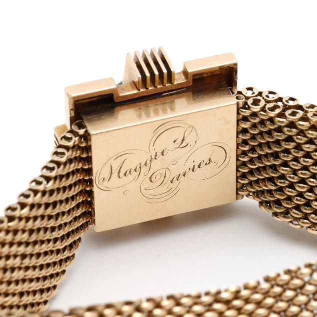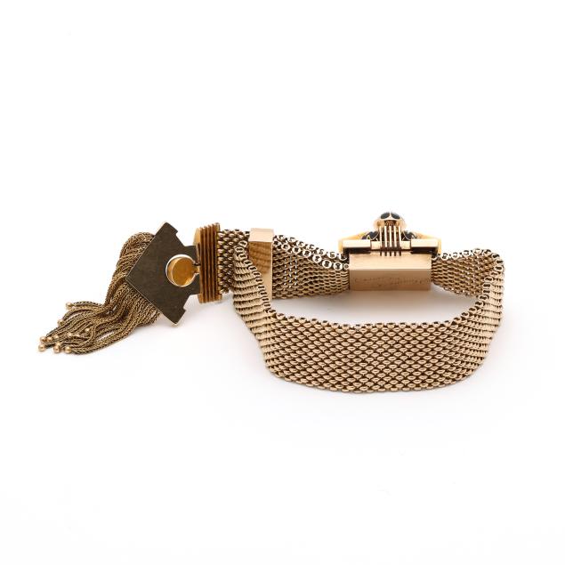 Bracelet in a mesh design, the square form slide with engraved detailing and with a raised floral motif with enamel detailing and a seed pearl accent, completed with a stylized arrow with textured ground and a floral motif with enamel and seed pearl, suspending multiple tassels, clasp with engraving, testing 14KT.