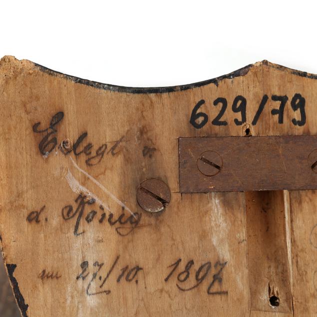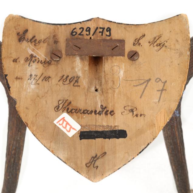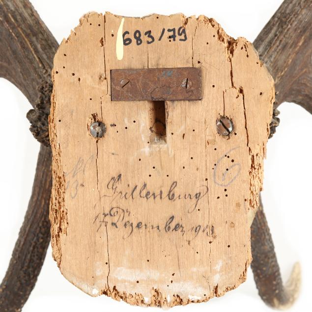 Late 19th century, to include smaller eight-point, and larger ten-point stag antlers mounted to wooden shield plaques marked with (likely German or Austrian) harvest information on back.