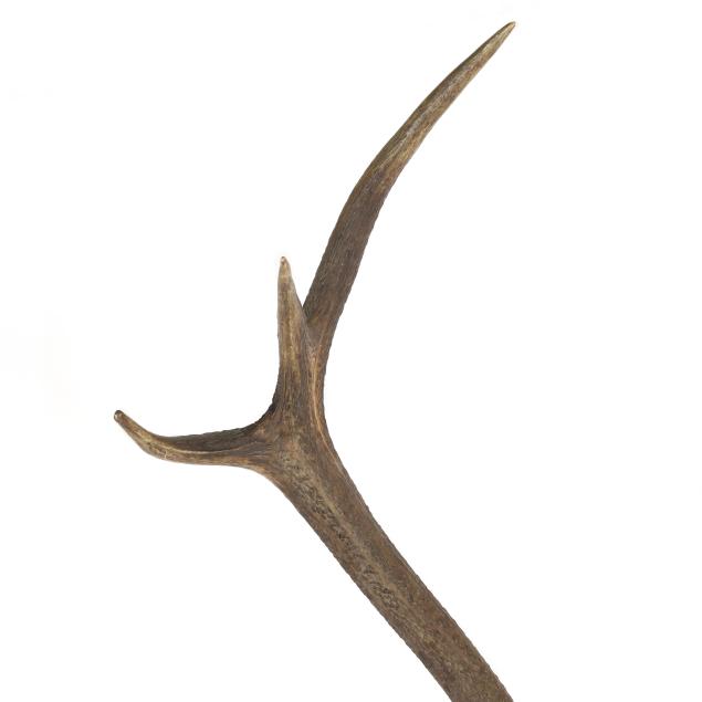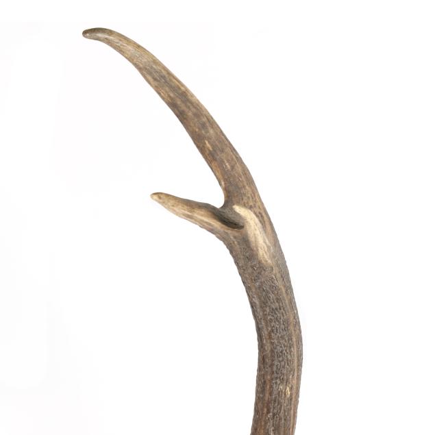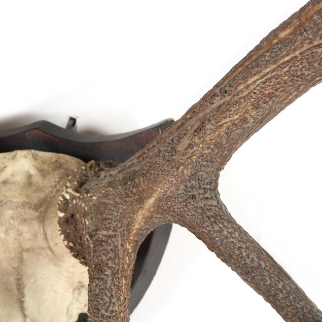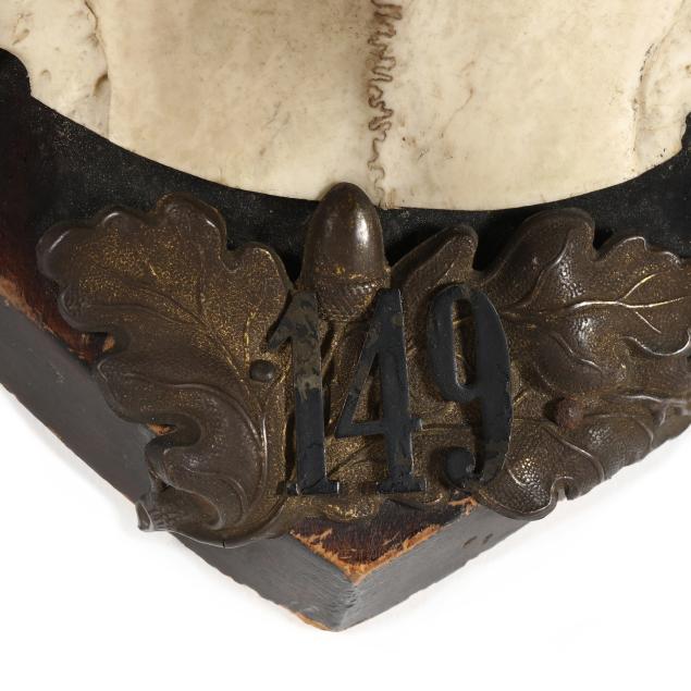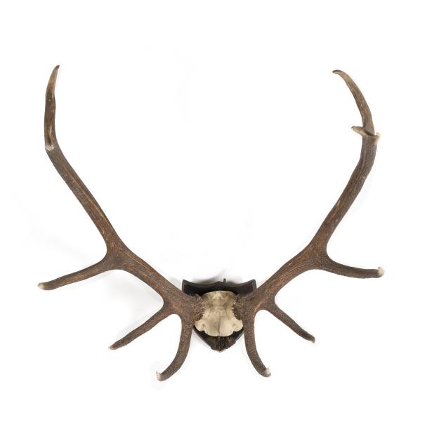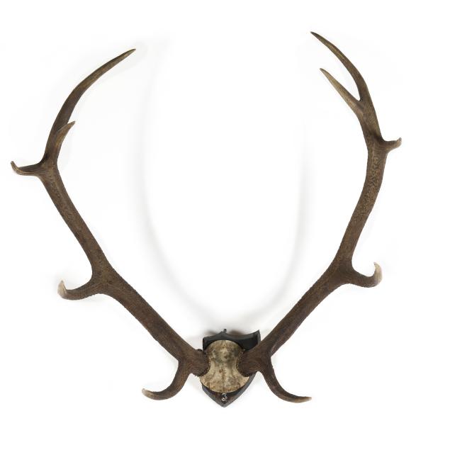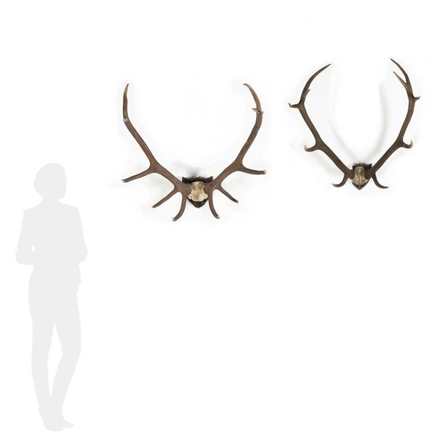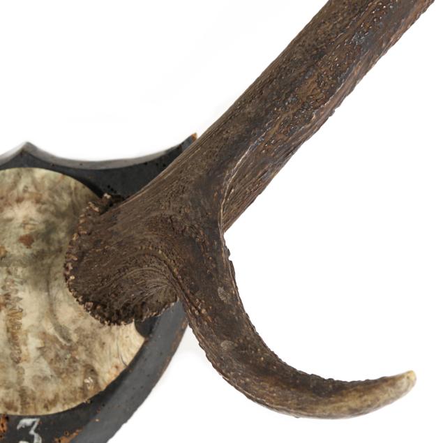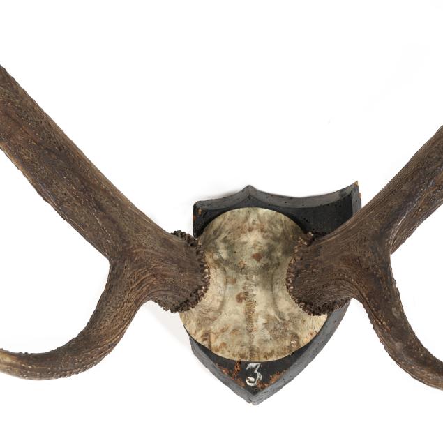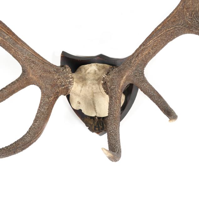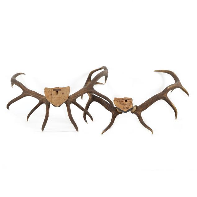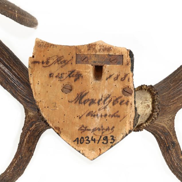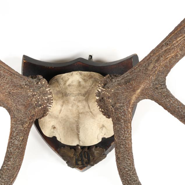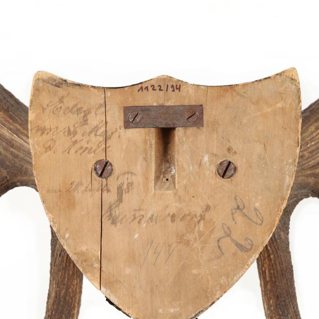 Late 19th century, to include a ten-point and eleven-point stag antlers mounted to wooden shield plaques marked with (likely German or Austrian) harvest information on back, one wooden shield has a metallic decorative hunting plaque attached to the base featuring two oak leaves and a central acorn with cataloging number 149.