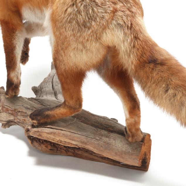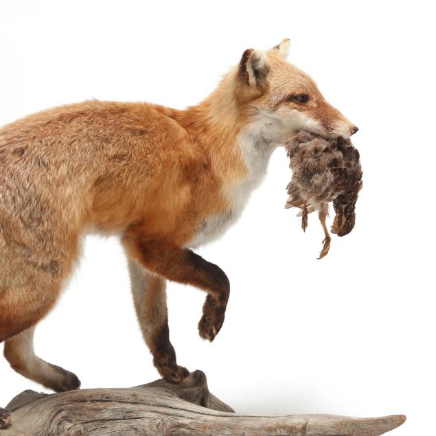 Measures 33 inches from tip of tail to nose, stands 21 3/4 in. on natural wooden stand, with quail clinched in mouth.